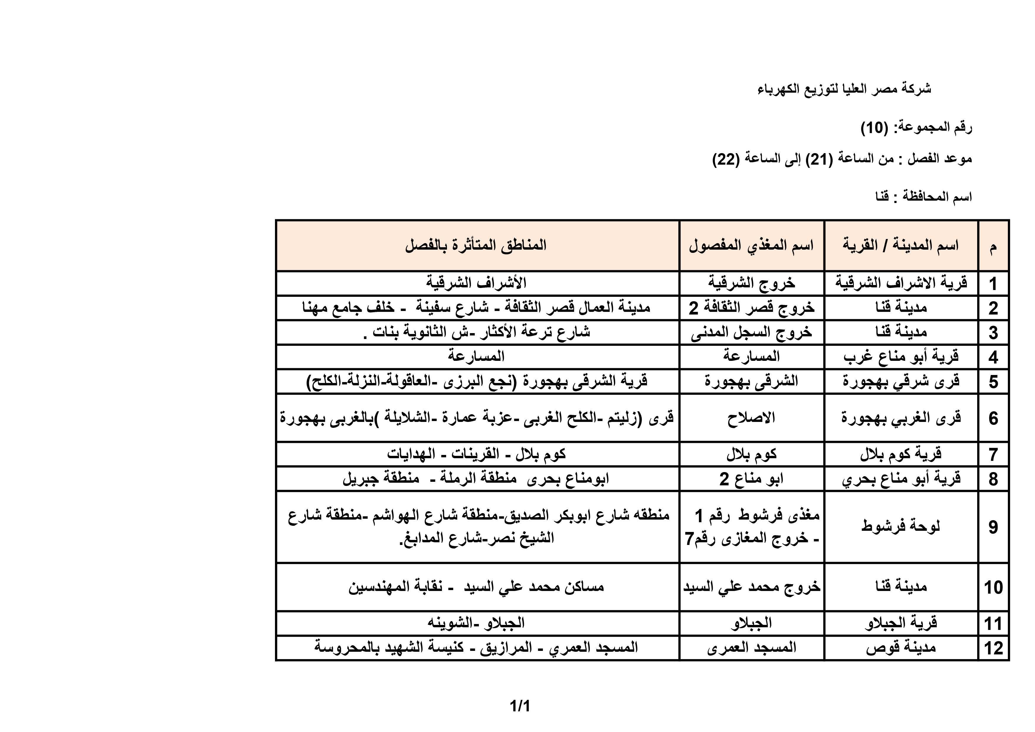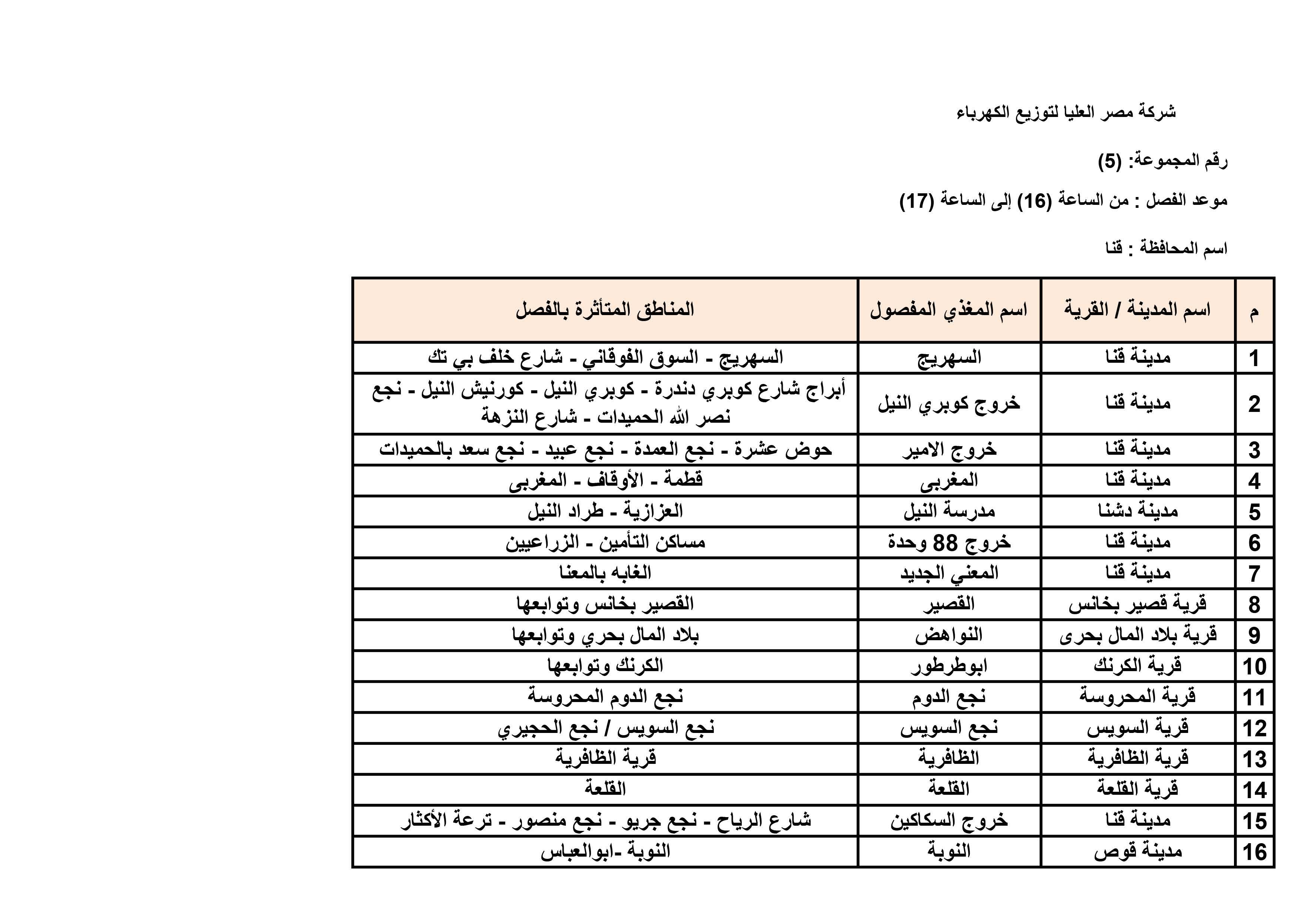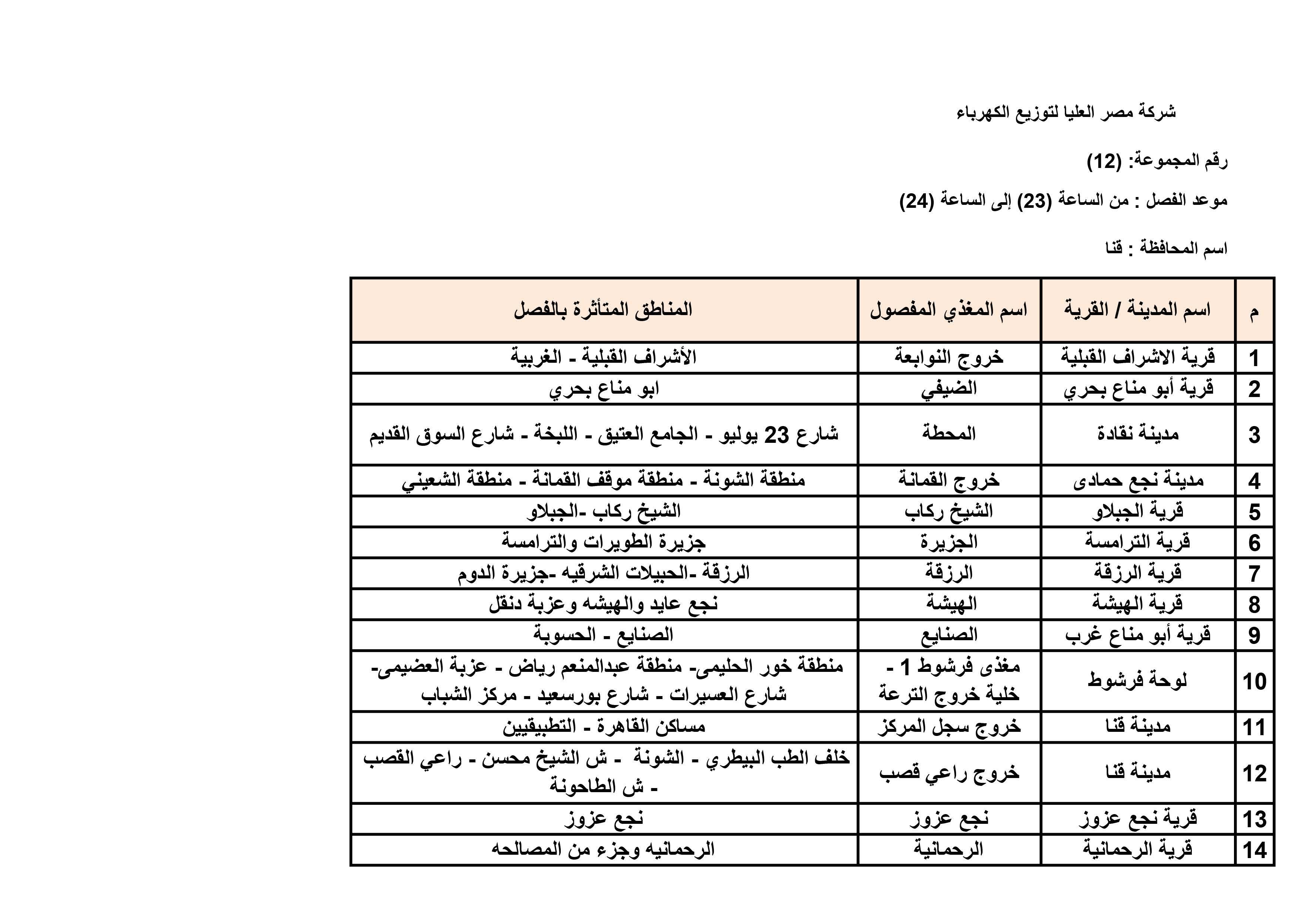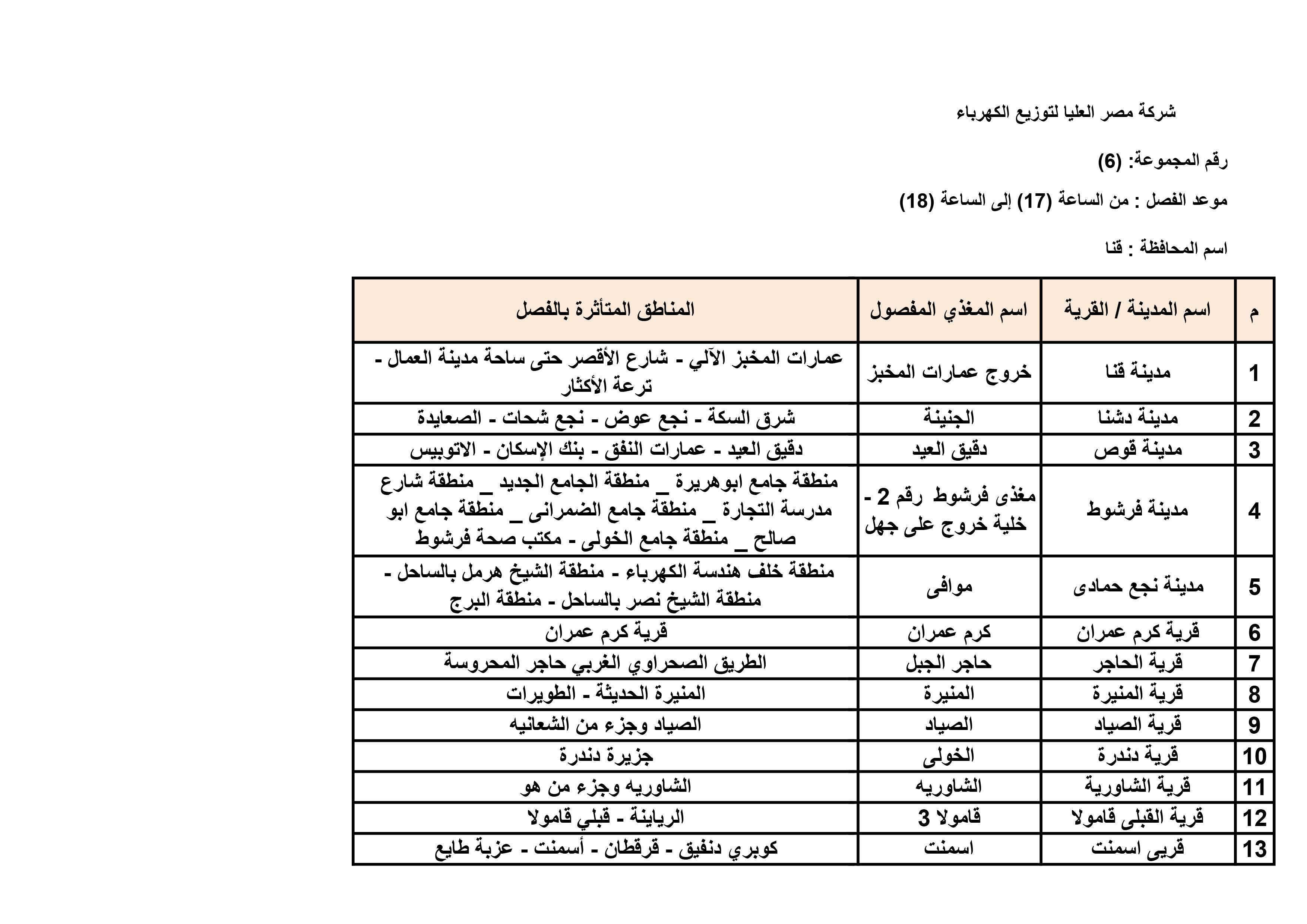 الحكومة تعلن جدول مواعيد تخفيف أحمال الكهرباء فى محافظة قنا