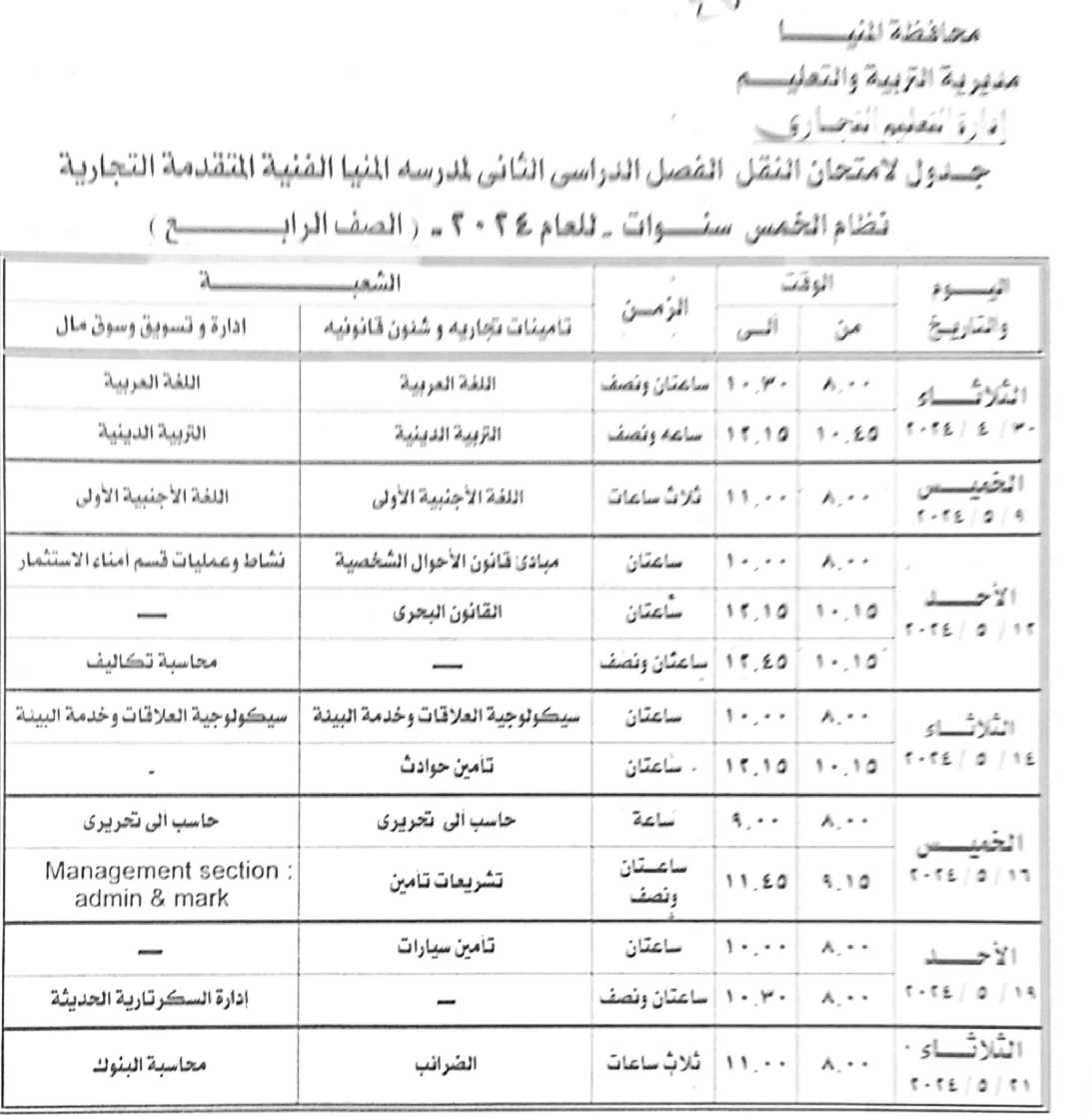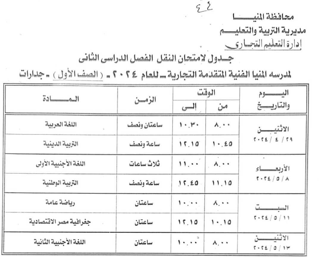 محافظ المنيا يعتمد جداول امتحانات الفصل الدراسى الثانى لصفوف النقل والإعدادية