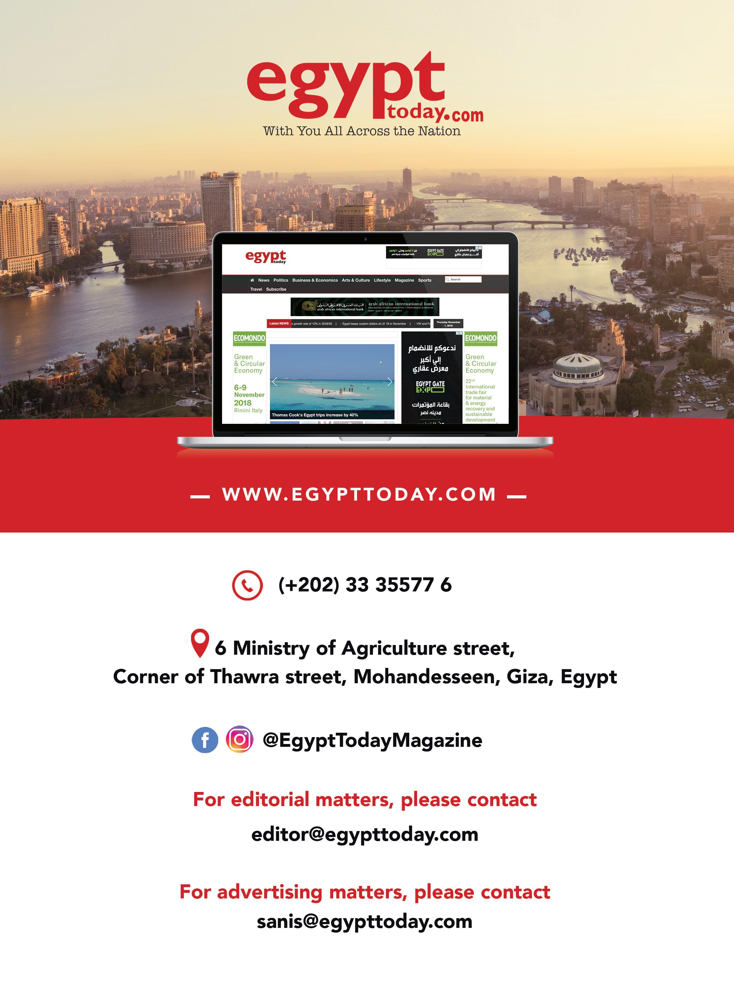Find us online at egypttoday.com. For more information email editor@egypttoday.com