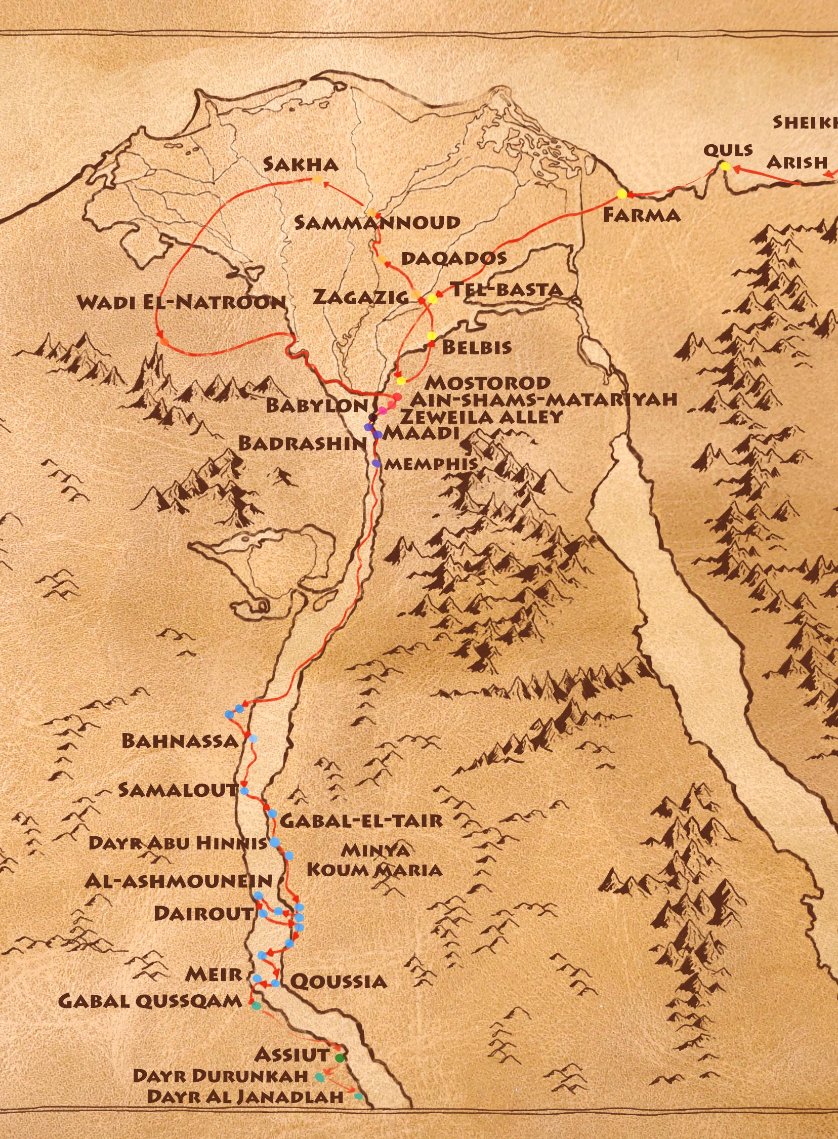 The pilgrimage includes 22 stops that begin in Rafah, North Sinai at the northeastern border and end in Asyut, Upper Egypt, where the Family is thought to have taken a boat journey on the River Nile. Many of these locations have been turned into monasteries and churches.