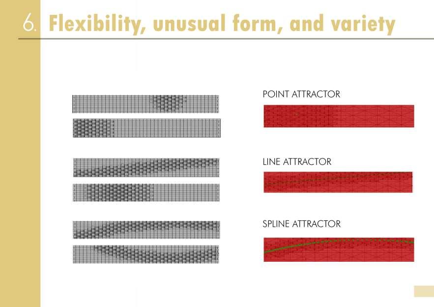 Elle permet une flexibilité en termes de formes, mais aussi en termes d’itérations, permettant ainsi plusieurs variations d’un seul design « programmé » aucontraire de méthodes classiques qui demandent une modélisation à nouveau pour chaque changement voulu dans le design. Donc peu importe la forme, en la conception paramétrique est une méthode de penser et concevoir qui peut être exploitée dans une panoplie de contextes.
