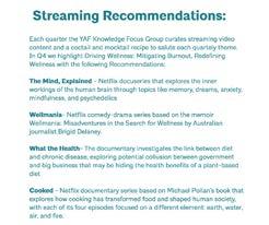 Each quater the YAF Knowledge Focus Group curates streaming video content and a cocktail / mocktail recipe to salute each quarterly theme. In Q4 we highlight Driving Wellness: Mitigating Burnout, Redefining Wellness with the following recommendations: