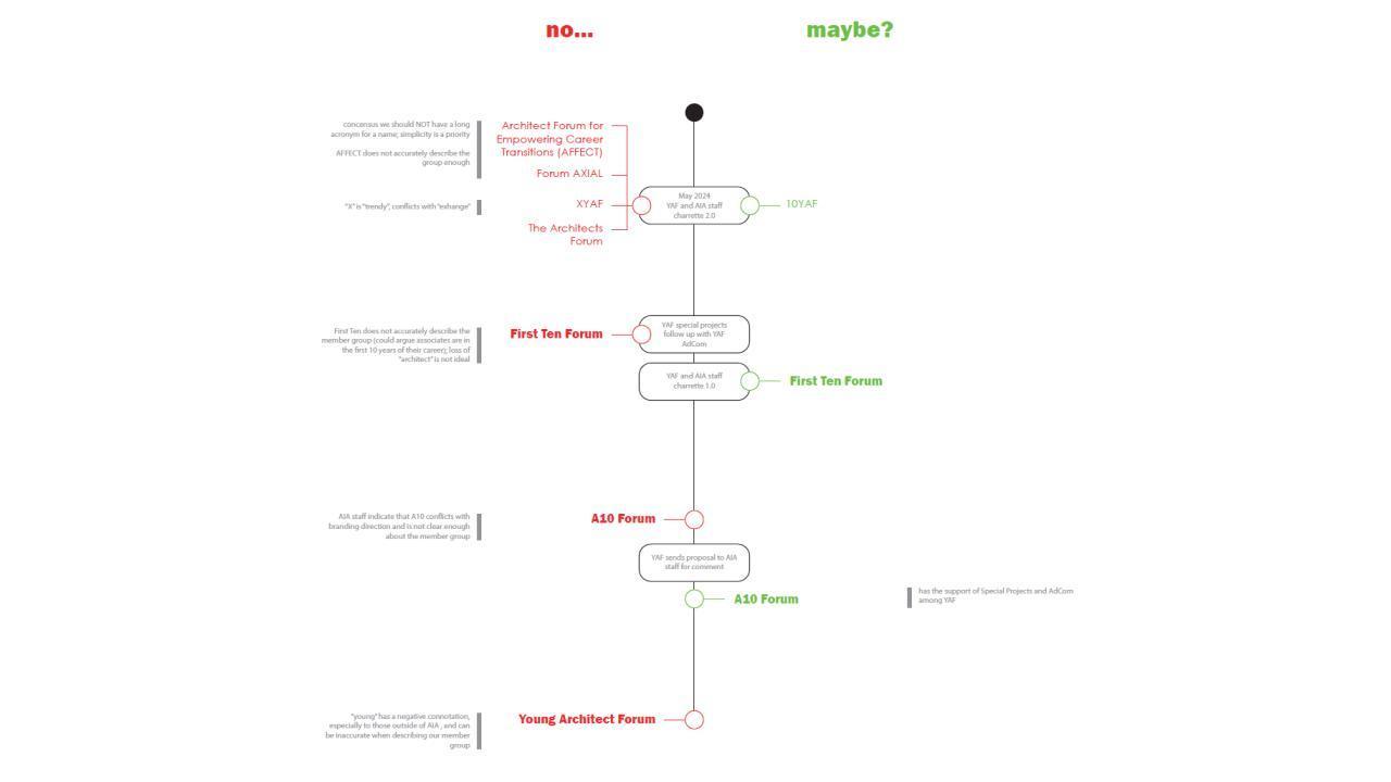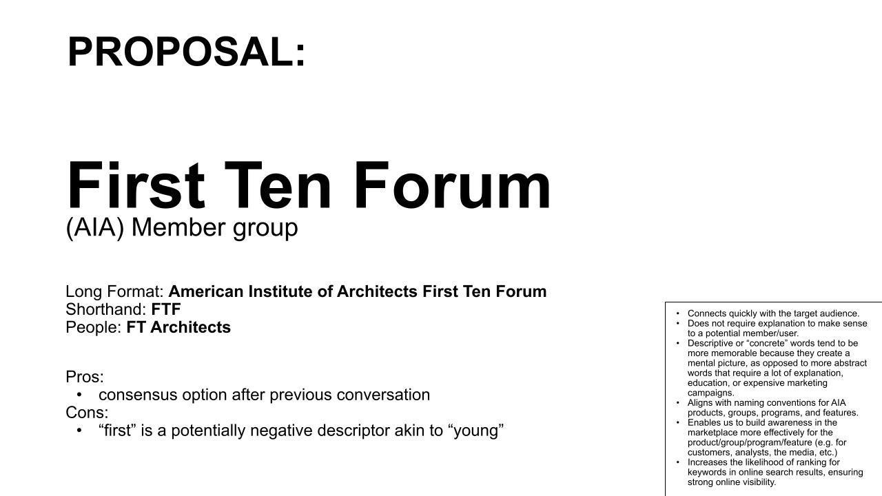 Renaming charrette held with AIA Marketing and Communications and AIA Knowledge and Practice staff. A10 Forum not acceptable per AIA Naming Guidelines. "First Ten Forum" proposed as an alternative committee name to consider.