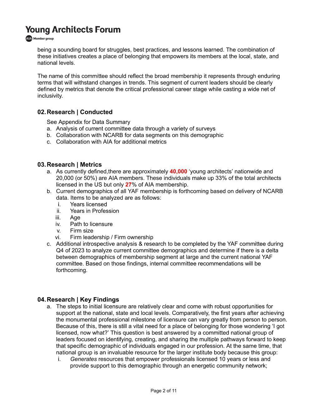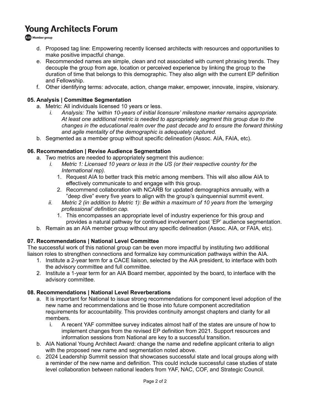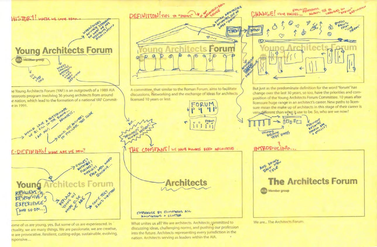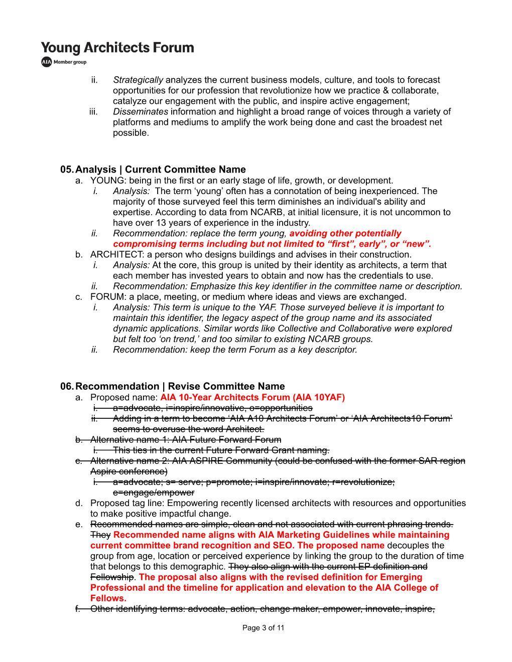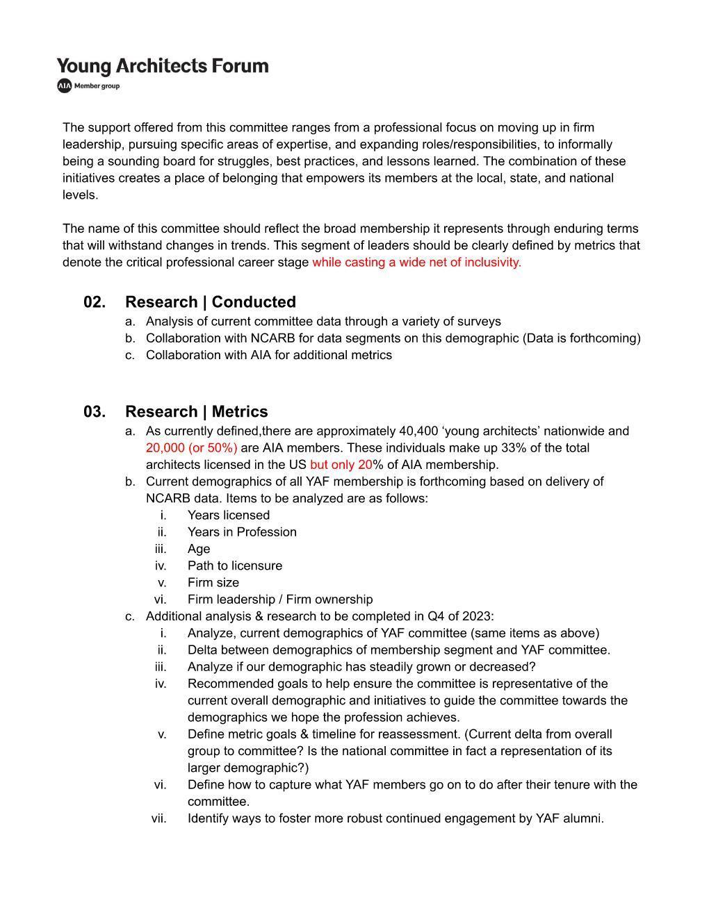 • Inquire if the name "Young Architects Forum" serves the current member group and committee, and if the current definition of the committee demographic fits how we should move forward.