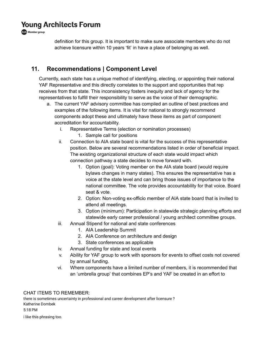 Learning and Growth Professional Licen sing and Credentials Putting aside all my experience with YAF, on the surface to someone who hasn't heard of it- it sounds more just like a gathering/programming/support space for young architects. More like the YAF local chapters operate- hosting monthly events, supporting people through licensure (given that I would say MOST attendees of YAF Chicago events are NOT licensed, and usually 0-5 years out of school) As a National leadership body 8/11/2025 10:45 AM