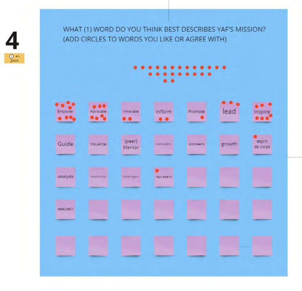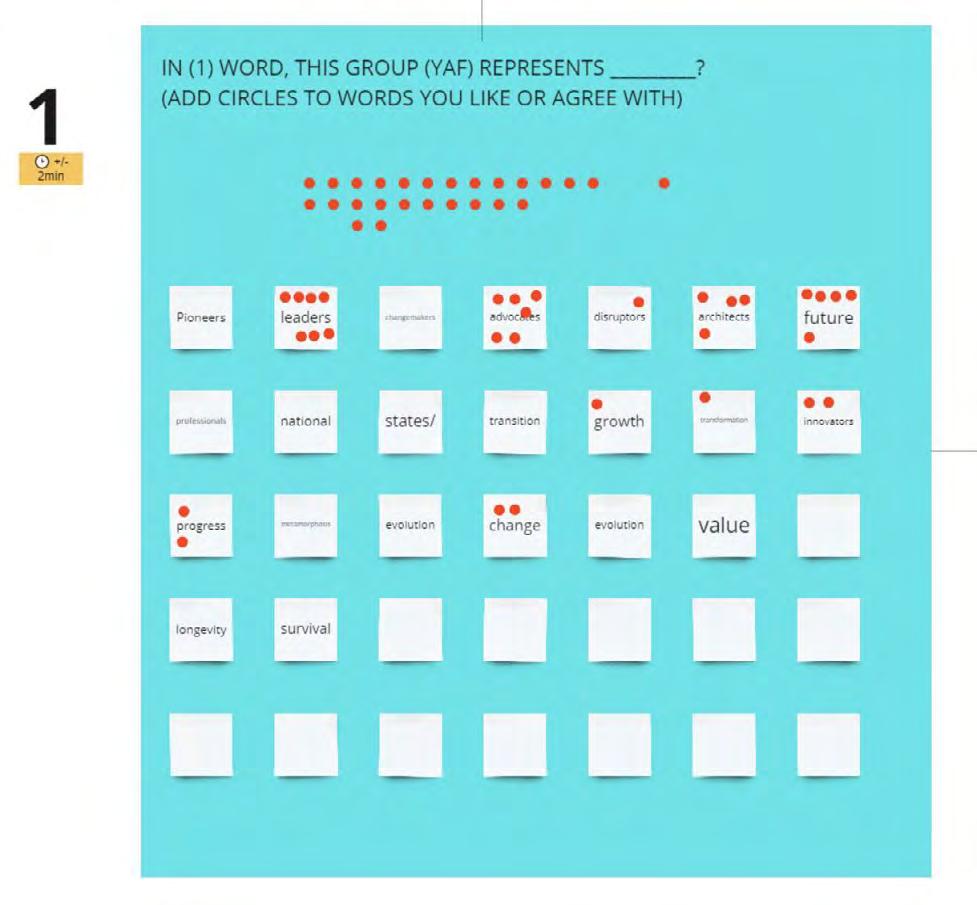 Engaging YAF's 60+ members through digital platforms such as Mural and Menti for interactive feedback, word association exercises and brainstorming sessions.