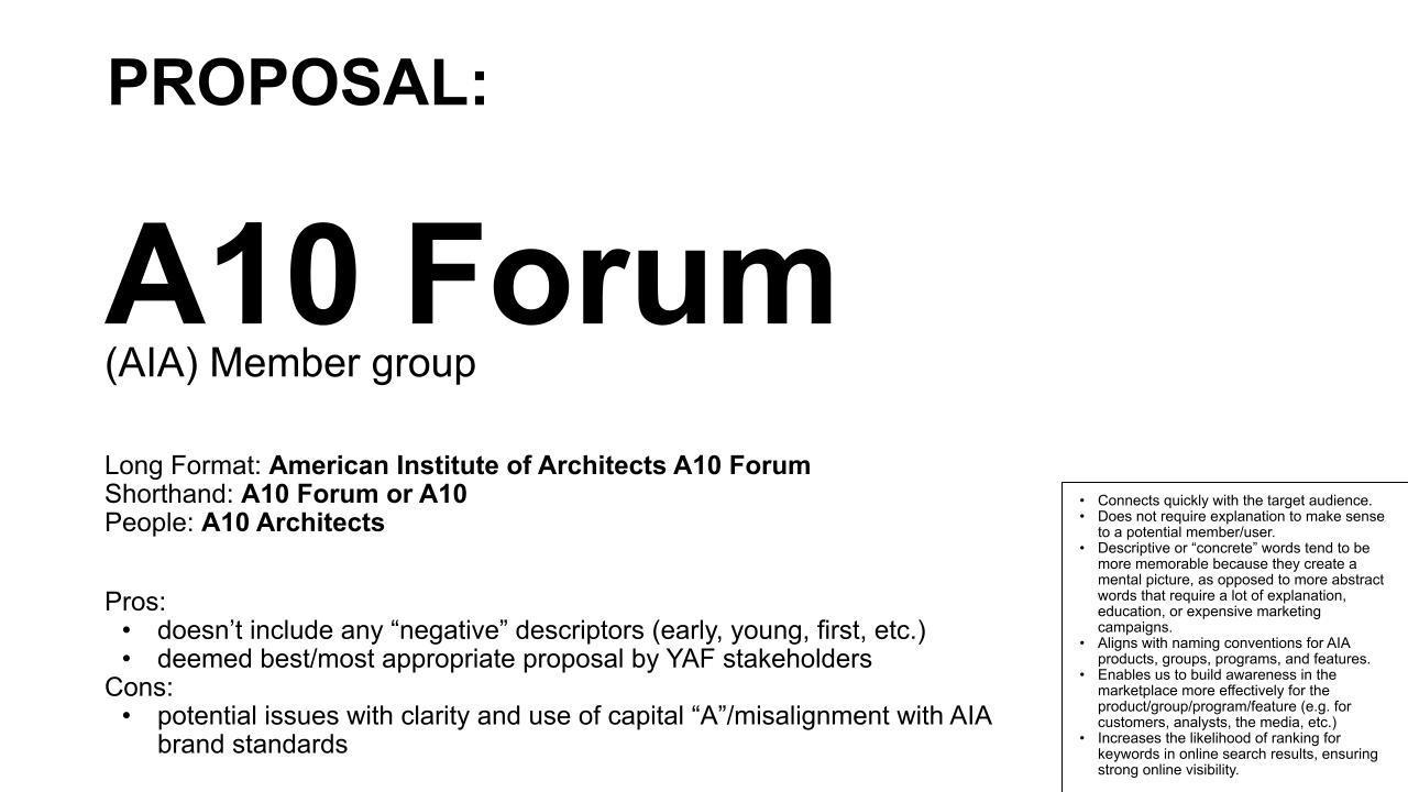 Alternate committee name "A10 Forum" proposed to AIA staff.