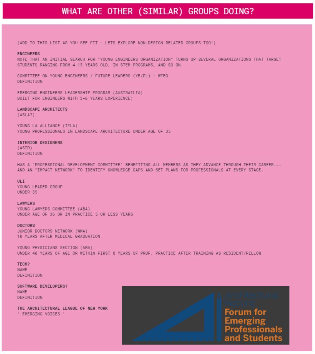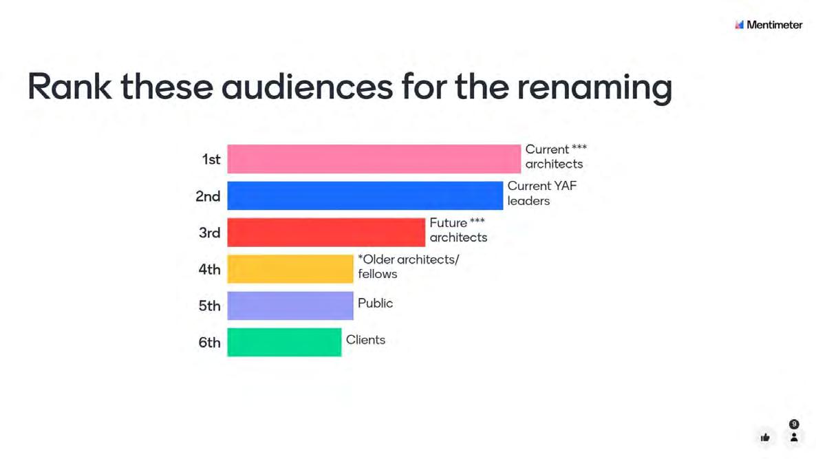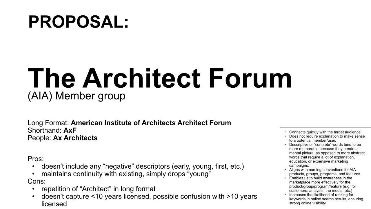Identity and Values It feels like a supportive peer space, but also like a label from a different era. 'Young' can be limiting, especially as many architects are licensed later in life The name might unintentionally undercut the professionalism and leadership of those it serves