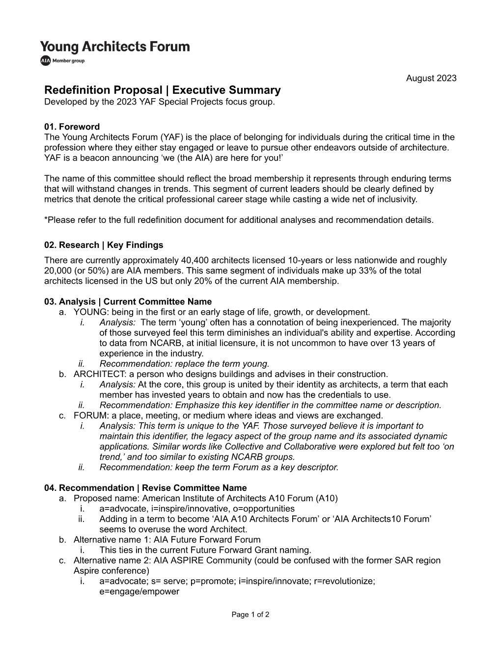 A planning debrief for Mission 2130 (held in Pittsburgh, PA in August 2022) alongside AIA Leadership yielded interest in renaming the YAF.