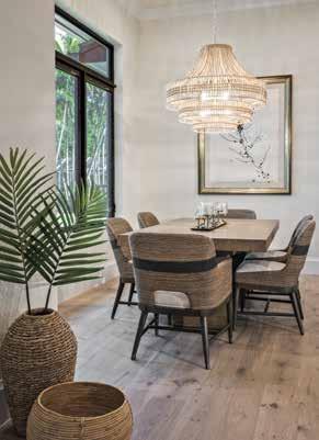 A warm, charming place for family to gather, the dining area and kitchen resonate with great taste. The living room opens into one large space, complete with kitchen table and chairs in natural, warm brown tones, both light and dark, by Palecek. Dining chairs are a woven natural jute rope with a black accent strip that runs across the back. A mesmerizing wood-beaded chandelier above the dining table fashions a fascinating centerpiece, while an impressive island table with waterfall top, constructed with porcelain tile to create a marble look, is designed to be consistent with the overall palette of beige, gray, and black. Unique lighting above the island consists of a trio of woven rattan pendants by Currey Company. Add a gold faucet with black hardware on the cabinetry and accented black glass doors on the upper cabinets for a finished, professional look.
