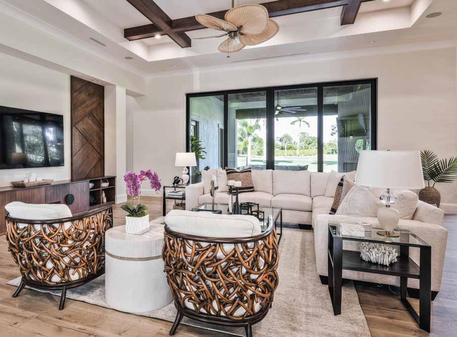 “The wood flooring is consistent throughout most of the house,” adds the designer. “The living room looks out onto the covered lanai with its outdoor kitchen and overlooks the golf course.”