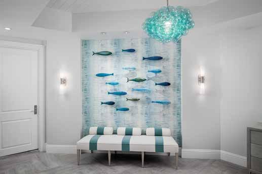 Custom chairs from Design Master Furniture echo the vinyl clad stools at the kitchen island, but have a bit of added luxe with their patterned velvet backs and acrylic legs. They provide seating at the chic and modern Arcadia dining table from Bernhardt crafted from acrylic and stainless steel. Graced by a faux wood top with silver leaf backing, the rectangular table resembles a glistening block of ice. Above, Hudson Valley’s Liberty chandelier has retro coil bulbs in ballooning clear glass alternating with exposed filament bulbs and protruding rods refracting light from crystal and icy handcrafted glass discs. Floor-toceiling sheer window treatments and motorized shades diffuse radiant sunlight streaming in.