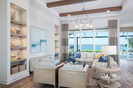 The estate was originally slated to be a model home, but the homeowners bought it at an early phase of construction, and trusted Ruta Menaghlazi, Vice President of Design at Theory Design, a Seagate Development Group company in Estero, to personalize it to their liking. “We were brought in from day one by the owners to make the residence more comfortable when entertaining,” explains Menaghlazi. “They liked neutral earth-tones, so that was a driving force as we chose the palette.” The home lends itself to a more modern feel with a bit of industrial flair to it. Two of the more challenging aspects of the design process, Menaghlazi points out, was the fact that the home is located in a neighborhood with a lot of new construction, so the traffic was congested and, thanks to supply chain issues with the cabinetry, furniture, and lighting, her team had to work with tight deadlines. Even so, they stayed on schedule. While Menaghlazi loves the entire project, the main living area is special to her. “The open plan is always my favorite. I’m a big fan of the soffit and cove ceilings, and LED strip lighting.”