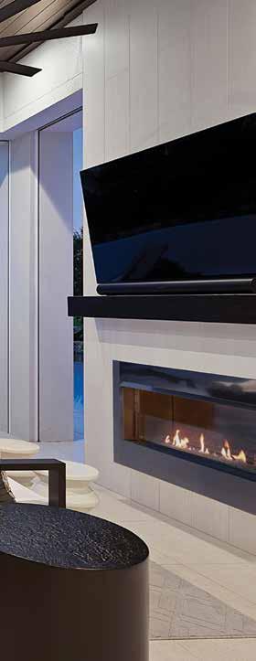 Custom chairs from Design Master Furniture echo the vinyl clad stools at the kitchen island, but have a bit of added luxe with their patterned velvet backs and acrylic legs. They provide seating at the chic and modern Arcadia dining table from Bernhardt crafted from acrylic and stainless steel. Graced by a faux wood top with silver leaf backing, the rectangular table resembles a glistening block of ice. Above, Hudson Valley’s Liberty chandelier has retro coil bulbs in ballooning clear glass alternating with exposed filament bulbs and protruding rods refracting light from crystal and icy handcrafted glass discs. Floor-toceiling sheer window treatments and motorized shades diffuse radiant sunlight streaming in.