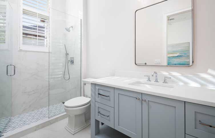 24x24-inch tiles emulating marble from Wayne Wiles Floor Covering are used in the sumptuous master bath. Complementary smaller print floor tiles, combined with ivory wall tiles, line the glass, walk-in shower which has a trio of Moen shower heads. Floating underlit cabinetry in a light gray shade holds twin trough sinks in the white quartz counter. Recessed and backlit mirrors above the counter and built-in vanity chase any shadows away in this bright bathroom.