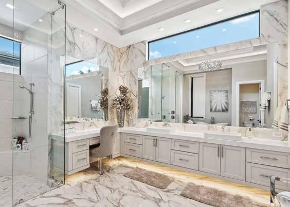 24x24-inch tiles emulating marble from Wayne Wiles Floor Covering are used in the sumptuous master bath. Complementary smaller print floor tiles, combined with ivory wall tiles, line the glass, walk-in shower which has a trio of Moen shower heads. Floating underlit cabinetry in a light gray shade holds twin trough sinks in the white quartz counter. Recessed and backlit mirrors above the counter and built-in vanity chase any shadows away in this bright bathroom.