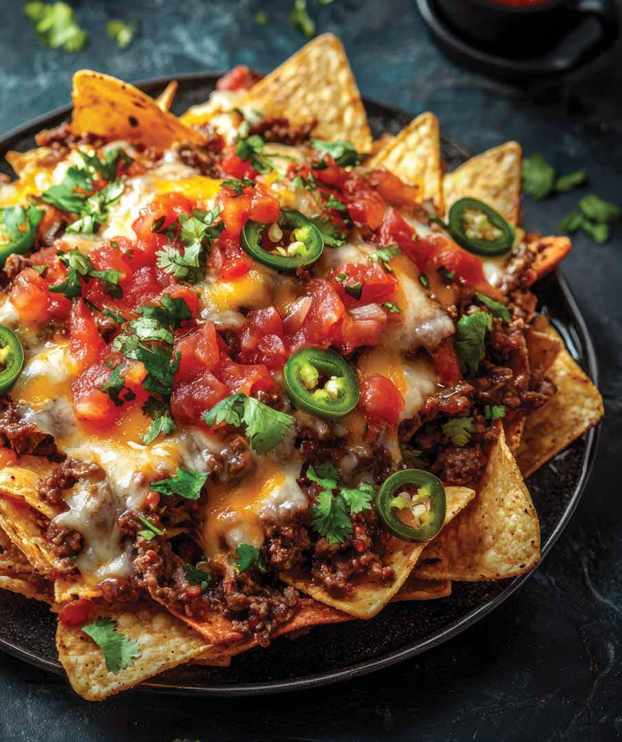 5. Scatter tomatoes, avocado, red onion, jalapeño slices, and cilantro over the hot nachos. Serve with lime wedges and desired extras.