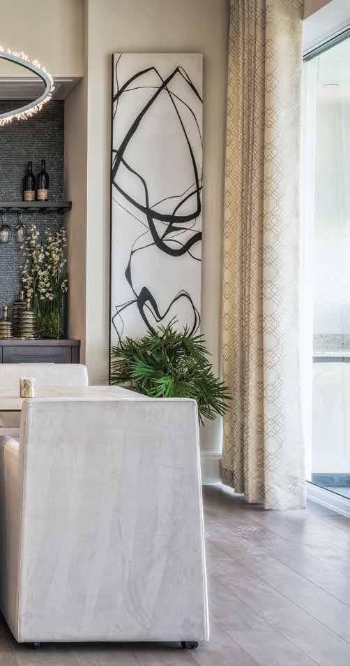 A closer view of the dining area displays a beautiful space decorated with a custom-designed black and white free-flowing picture crafted by a CDH art vendor—with the unusual dimensions of 24 inches wide by 84 inches high. The dining room table holds a European ceramic tabletop with refractory ends. “Featured on the back wall, which showcases the built-in wine bar with backlit LED lighting, is a mica-flect wallpaper that’s the same as the fireplace wall in the family room which connects the two spaces,” says the designers. Glorious glass candlesticks blend beautifully with the blingy oval lighting ring.