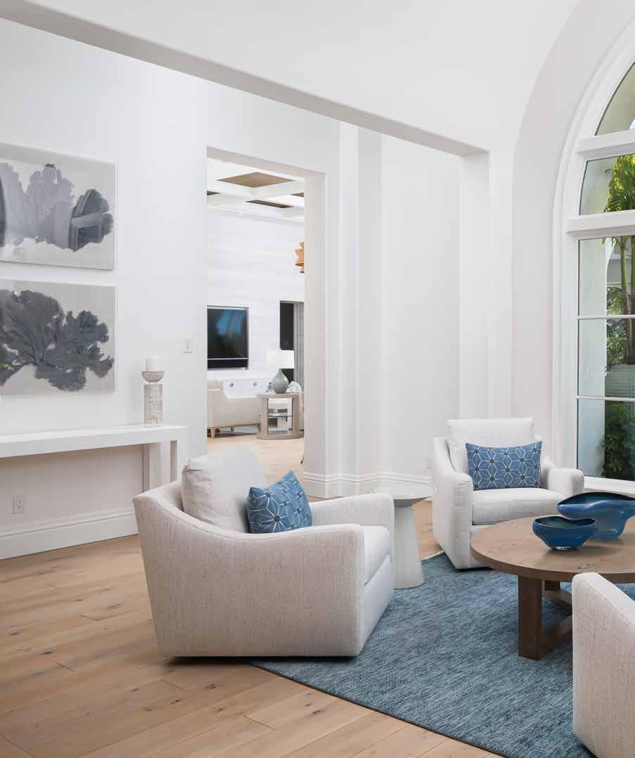 As you walk into the home, the piano room sits to your right while to the left is the dining room. Here, a dazzling ceiling lighting fixture, brought by the owners, is shaped like a symmetrical star snowflake designed in silver with bulbs inside and pieces of crystal extending out. It serves as a captivating focal point while the grand Steinway piano speaks of refinement and luxury. “The owner loves playing the piano,” Johnson expresses. Bringing in hues of blue, avocado green, and silver through the accessories, the room emanates a lively vibe that the decorative butterfly artwork, also brought by the owners, enhances. The striking sofas are by Thayer Coggin and the glass etagere cabinet is by Century Furniture. Light wood flooring has been installed throughout the home and the area rug in shades of avocado green and turquoise blue, as well as all of the carpeting in the residence, was brought by the owners. A large picture window reveals tropical palms indicative of South Florida vegetation.