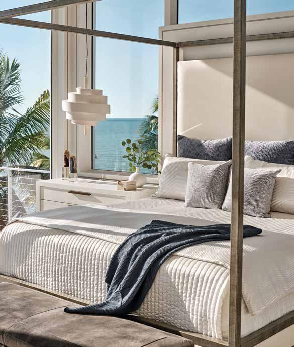 The incredible view seen through the wall of glass in the principal bedroom is enhanced by the simplicity of its furnishings. The metal canopy bed has a champagne finish and features an upholstered headboard in ivory linen. Pops of color from decorative pillows top the quilted bedding of organic cotton, and texture is provided by a suede-clad bench at the foot of the bed.