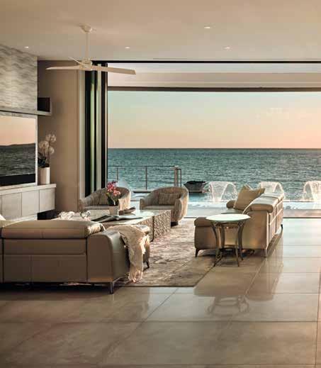 The unbroken vista from the main-floor living area shows the infinity-edge saltwater pool with its triple fountains and twin fire bowls and affords a stunning view of the Gulf of Mexico and its legendary sunsets.