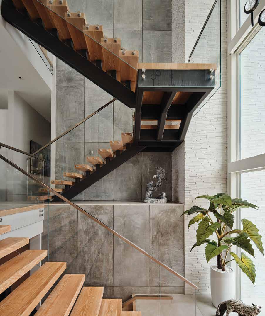 The grand staircase is a sculptural engineering feat anchoring the home with quiet drama. It features a mono-stringer design using a single central beam of blackened steel, open-riser treads of rich white oak, and a tempered glass balustrade with a metal handrail. The focal wall behind the staircase is a large-format textured stone panel mimicking concrete, providing an industrial yet refined backdrop to the structure.