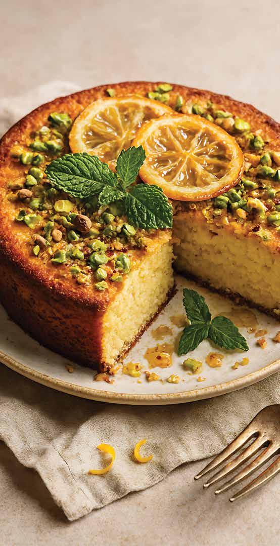 3. Sprinkle chopped pistachios over the cake. Garnish with thin lemon slices and fresh mint before serving.