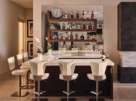The bespoke wet bar has a thick white quartzite countertop with a prep sink over a matte-finished dark wood custom cabinetry base. Seating for six comes via iconic Lem adjustable barstools by Lapalma, covered in bonded leather with footrests integrated into the chrome legs. A mirrored backdrop with floating walnut shelving creates a sense of depth while displaying premium spirits.
