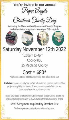 A number of Cooroy and local businesses have donated prizes/vouchers for raffles and auction prizes. Carol thanks them for their generous donations. If your business wants to be involved contact Carol on email belnews@ outlook.com or admin@cooroy.com.au