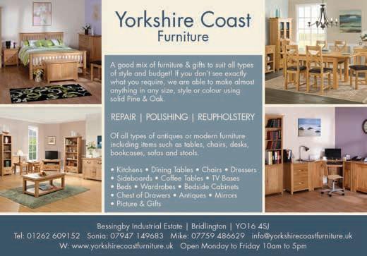 56 M J Sissons Roofing Services AERIALS TV aerial, satellite TV, CCTV & communications specialists dale comm 01262 333492 | 07711 796985 www.dalecomm.co.uk sales@dalecomm.co.uk FREE CALLOUTS AND FREE QUOTES! 15% DISCOUNT with this advert when you quote dale02 01262 609892 www.watsonupholstery.co.uk Greenways Workshop, 20 Church Green, Old Town, Bridlington, YO16 7JX IAN WATSON IAN WATSON IAN WATSON CONTRACT AND DOMESTIC For all kinds of upholstery 3 Piece Suites • High Seat Chairs • Cars, Boats, and Bike Seats • Foam Cut to Size Care Homes • Caravans and Motor Homes Pubs and Clubs • Restaurants Etc.