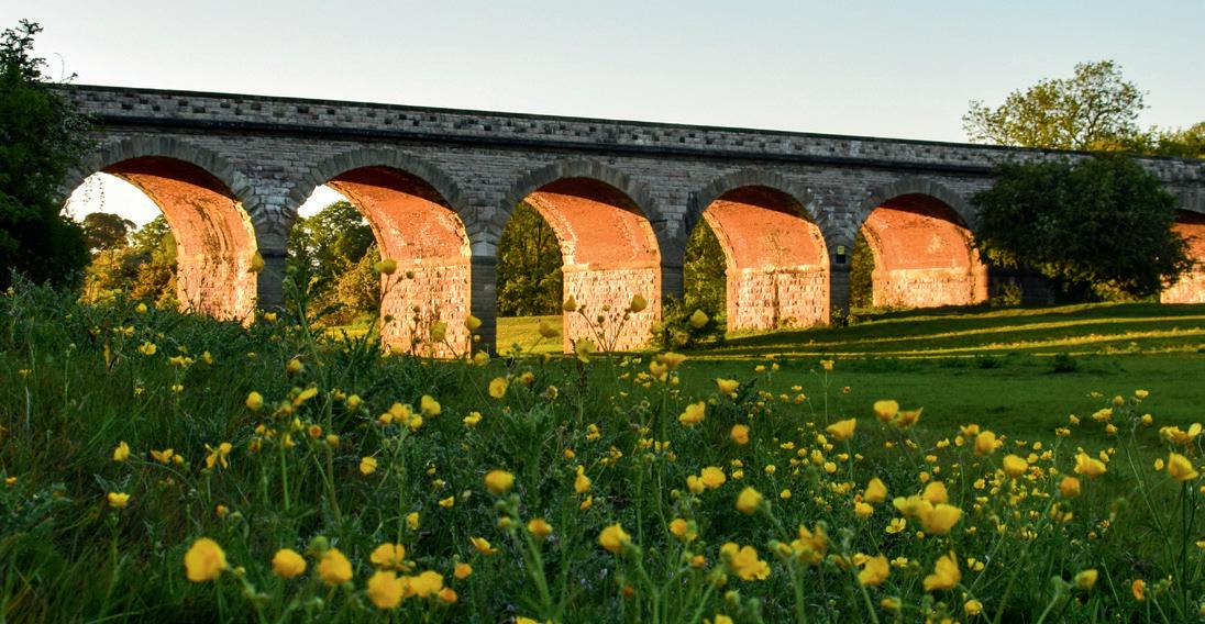 1/ Leaving the bus station/ carpark cross the road and turn left to go over the river on the bridge. Immediately over the river turn right to go over a few cobbles then follow the tarmac path with houses left to reach the riverbank. Now follow the river, passing the church to the left. Where the tarmac ends keep ahead passing the weir then going under the viaduct. Keep going until a small building appears near the river. Head for this (don’t veer left up a slope) then continue under a stone arch keeping close to the river.