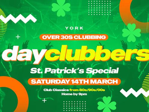 DAYCLUBBERS: ST PATRICK’S DAY SPECIAL, CIRCUIT York, YO1 9RD. 4.00pm-8.00pm. Fancy a St Paddy’s Day shindig, without the late night? Head down to CIRCUIT for a daytime party to remember, with OG DJs playing all of your favourite tunes from back in the day - make it home for bedtime! Visit www.skiddle.com/whats-on/ York/Circuit-York/York--DayClubbers-The-St-PatricksSpecial/41629477/ to book.
