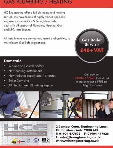 56 PLUMBING & HEATING // REMOVALS // ROOFING PLUMBING LTD PLUMBING LTD Combi boilers with 12 year warranty PLUMBING LTD PLUMBING LTD Plumbing Ltd • Boiler Installations • Servicing • Repairs • Showers • En-suites • Pressurised Cylinders • Smart Controls • General Plumbing Repairs ycp@btinternet.com 01904 780780 | 07860 839877 5 Oak Tree Lane, Haxby, York. YO32 3YL Tel: 01904 868389 Mob: 07968 390277 FENSOME PLUMBING All plumbing and gas work undertaken From leaking taps to full central heating systems Gas Safe Registered Plumbing & Heating Engineer GAS FITTING & CENTRAL HEATING JOE DALLIN • NO JOB TOO SMALL • FREE QUOTES CALL JOE 01904 848055 07834 350984 Installations, service & repairs of all domestic gas appliances & central heating 575277 M.W.V. REMOVALS 07703 333201 Full house or single item removal LICENSED WASTE CARRIERS York based 5 RATED JR 01904 903038 • 07503 108046 Call for a FREE no obligation quote PROPERTY MAINTENANCE ALL ASPECTS OF ROOFING WORK UNDERTAKEN • New roofs • Roof Repairs • Flat roofs • Commercial roofs • Fascias • Soffits • Guttering + more We also provide a storm damage roof repair service!
