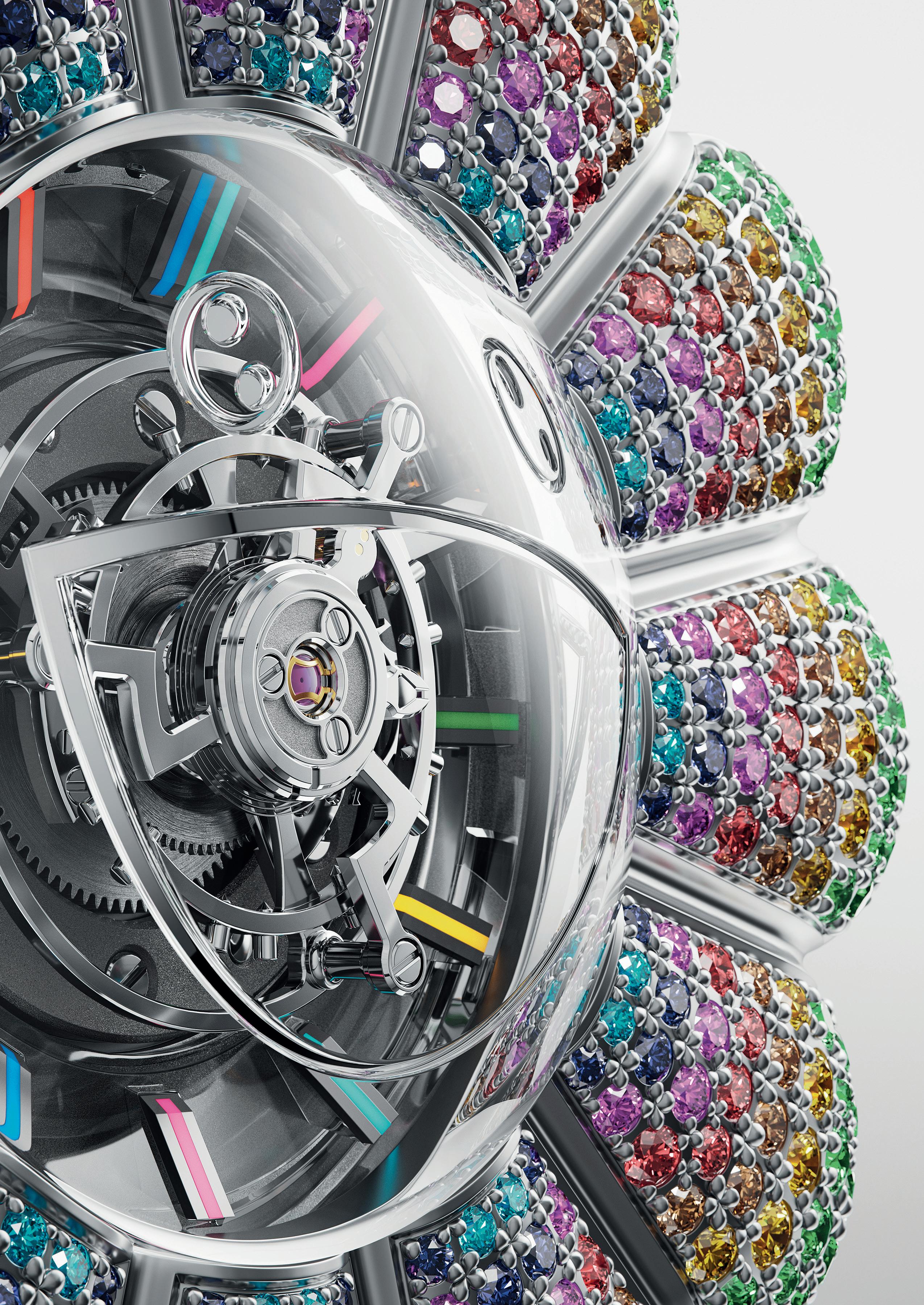 Floral composition is central to the work of Takashi Murakami. This Japanese artist has risen from humble origins to become one of the most sought-after artists in the world, and he has been a Friend of Hublot since 2020. These co-creations have always been produced in limited-edition series. This timepiece is even more limited, being truly unique - not just in its nature, but also in its construction. What sets the MP-15 apart from any other piece that the manufacture has ever created in its forty-plus years of experience, is its central tourbillon.