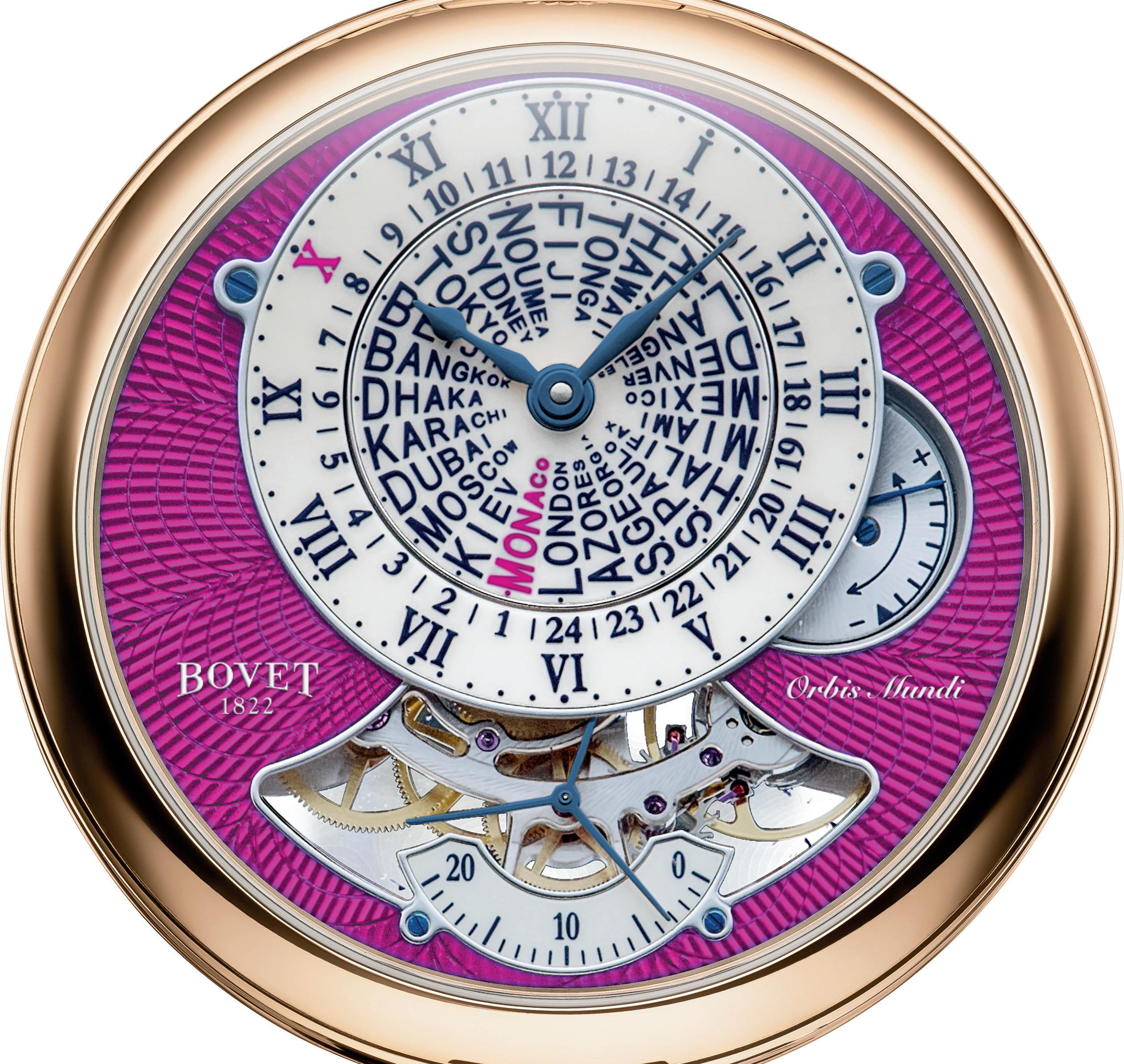 The dial of the Orbis Mundi is guilloché, covered with seven layers of vibrant magenta lacquer, each one applied by hand, then dried before the application of the next layer. When all