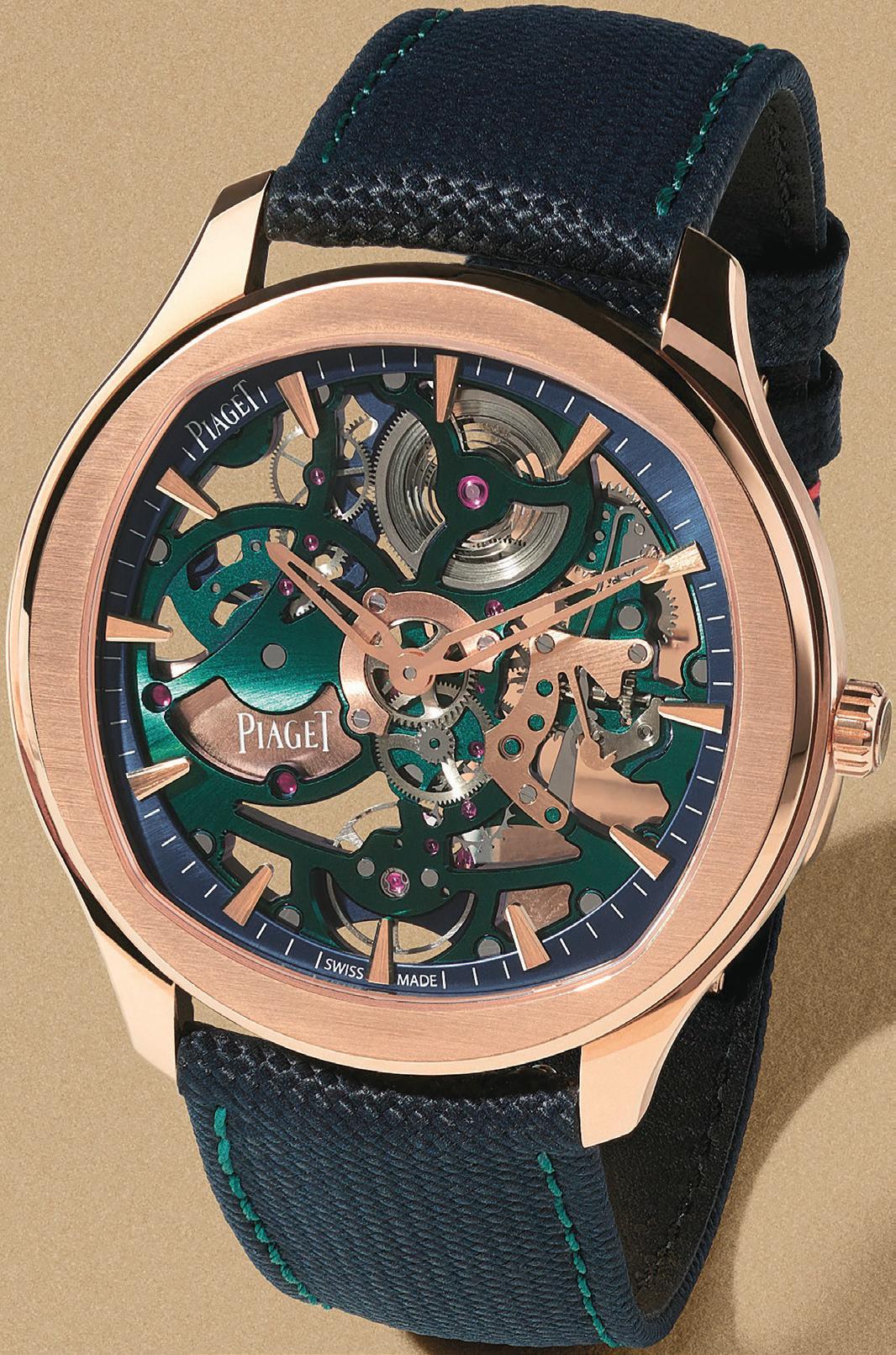 Beating to the rhythm of a coloured Manufacture calibre 1200S1, with green, blue and rose-gold coloured skeletonised bridges, all specifically designed for this unique piece, the ultrathin movement, only 2.4 mm thick, is housed within a rose-gold case measuring 42 mm in diameter and only 6.5 mm in thickness. This unique Piaget Polo Skeleton Arty is coupled with a blue interchangeable strap, also designed specifically for the occasion.