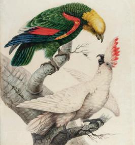 Below: Yellow-Headed Amazon Parrot ‘Amazona ochrocephala oratrix’ with Hybrid Cockatoo, Watercolour on Paper, 1801. By Sarah Stone (1760-1844). The Finch Gallery, Finch & Co.