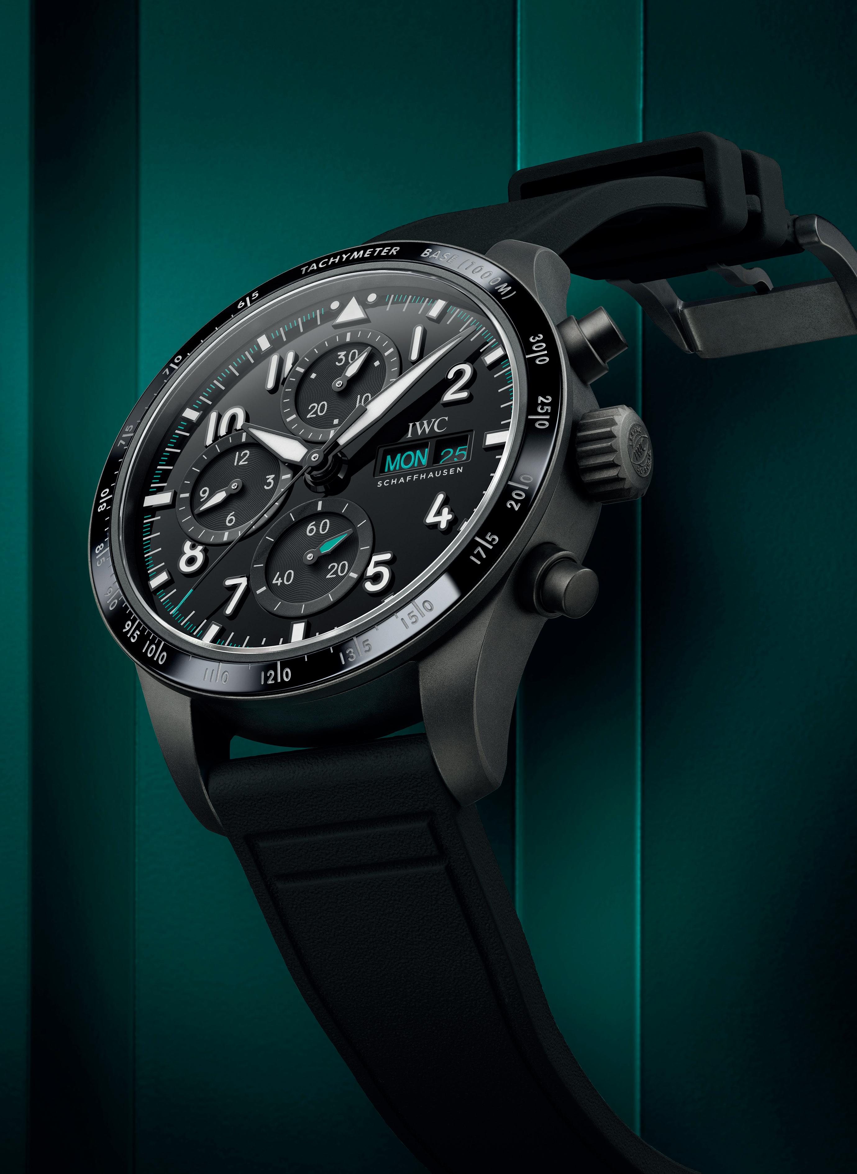 The Pilot’s Watch Performance Chronograph 41 Mercedes-AMG Petronas Formula One™ Team ( Ref. I W388306/07) features a case made of Ceratanium®. Developed by IWC, this material combines the lightness and structural integrity of titanium with a hardness and scratch-resistance similar to ceramic.