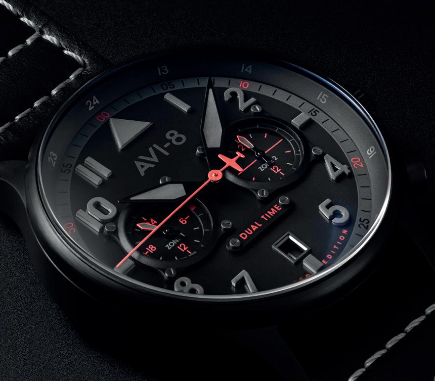 The Night Reaper Limited Editions are a remarkable capsule collection within the AVI-8 Hawker Hurricane family of timepieces. Each watch is coloured and camouflaged in a palette of deep black, reflecting the legendary Hurricane JX-E (serial BE581) flown by Kuttelwascher. The Classic Chronograph edition and the Carey Dual Time edition are a limited edition of 170 pieces each, whereas the Clowes edition is a limited edition of 120 pieces.