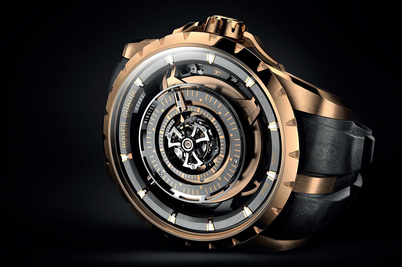 Within this latest creation, the central placement of the tourbillon has given the watchmakers a unique opportunity to play with the décor - and take their aesthetics in a different and more circular direction. This is most evident in the watch’s round lines and deep volume. As opposed to the emblematic Roger Dubuis position at 7 o’clock, the flying tourbillon sits neatly at the centre, setting the stage for a beautiful concentricity. The mechanism itself has also been purified as well as compacted, thanks to a new patent-pending planetary system, not only creating more space, but firmly establishing an alternate look compared to other tourbillons of the past.