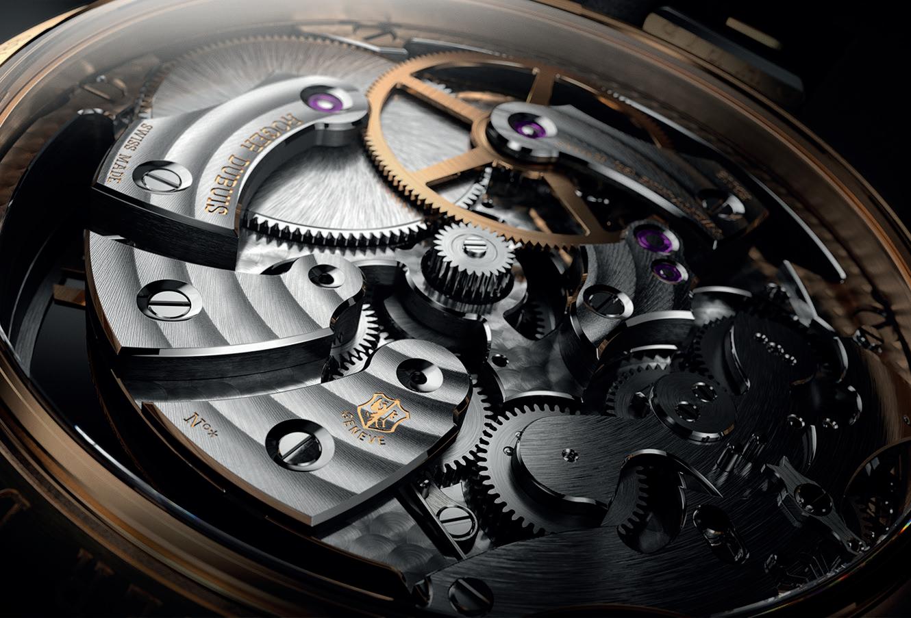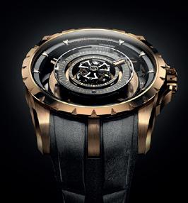 The 3D discs for the minutes and hours displays are particularly prominent and are contrasted by open-worked flying hands, mounted on ball bearings, that are double-sided and sharp. This particular display required the invention of a patent-pending system, which can safely disengage the hands and allow the watch to be set with assured stability. A similar doublesided approach has been taken for the flange, which houses the hour indications on the outer perimeter. Going one step further, the Maison’s watchmakers have set all of the circles at different heights, delivering a multi-levelled décor that draws the wearer in. While revealing a glimpse of the skeletonised calibre beneath, it once again shows the high level of modern workmanship at which Roger Dubuis is able to perform.