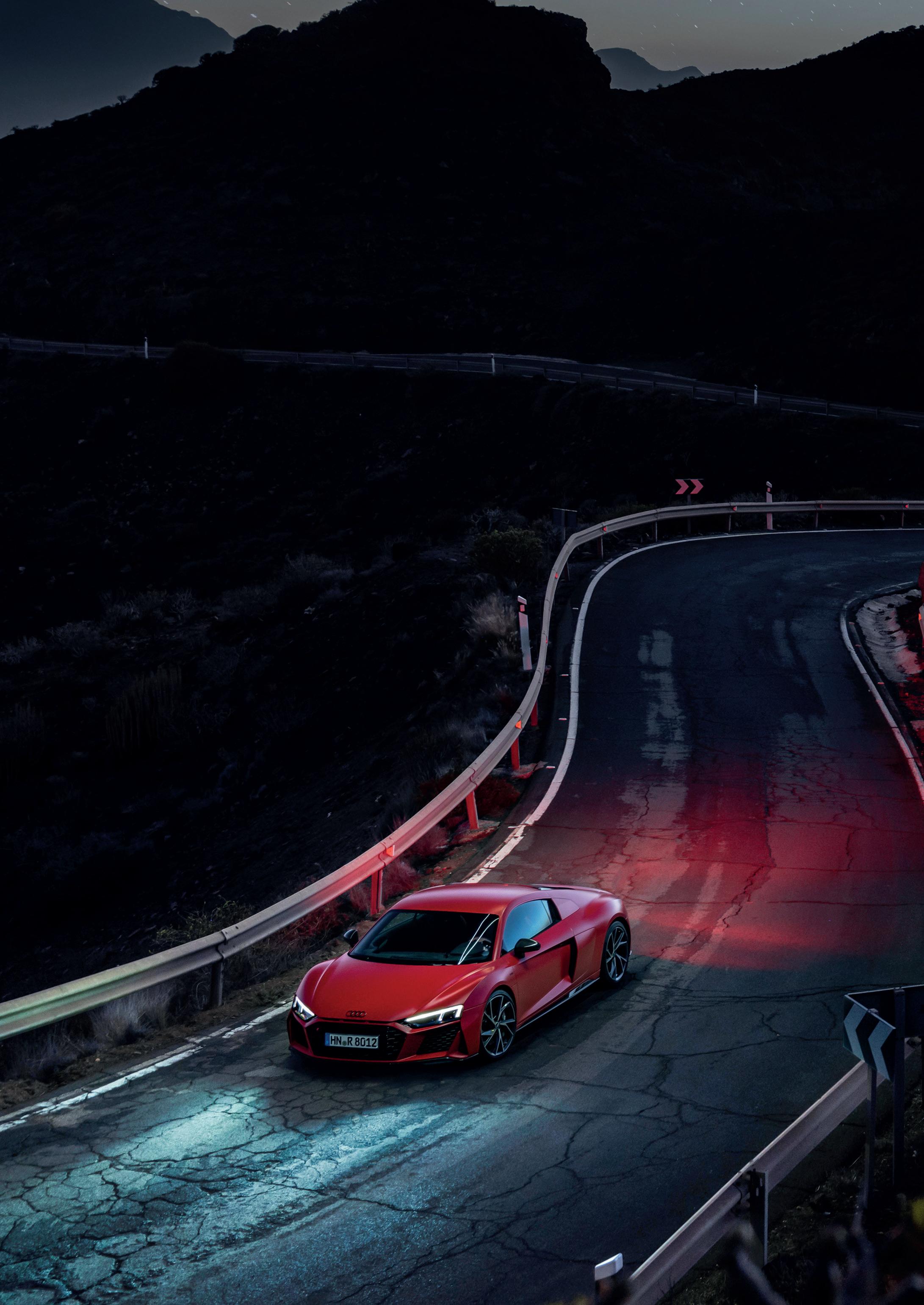 Horizontal lines give the front of the highperformance sports car its ultra-wide look - not that it needs much help. The wide and flat singleframe radiator grille features a matte black finish and bears the R8 emblem while above the wide front splitter sit the large air intakes that are divided into two sections