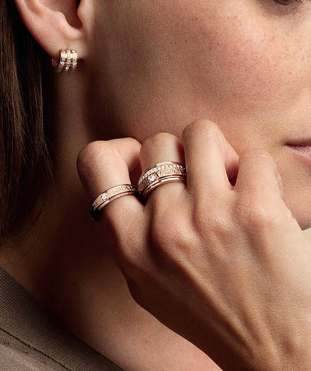 Created in 1961, the Décor Palace is the epitome of Piaget’s gold craftsmanship. Inspired by the guilloché technique traditionally used on watches, this Piaget signature adornment gives gold sumptuous light effects by meticulously texturing the precious material with irregular streaks. Manually engraved, each Décor Palace piece is one of a kind. Adding on to Possession’s exclusive turning element, the Palace Décor makes this new set of seven rings and one triple rose gold earring even more special.