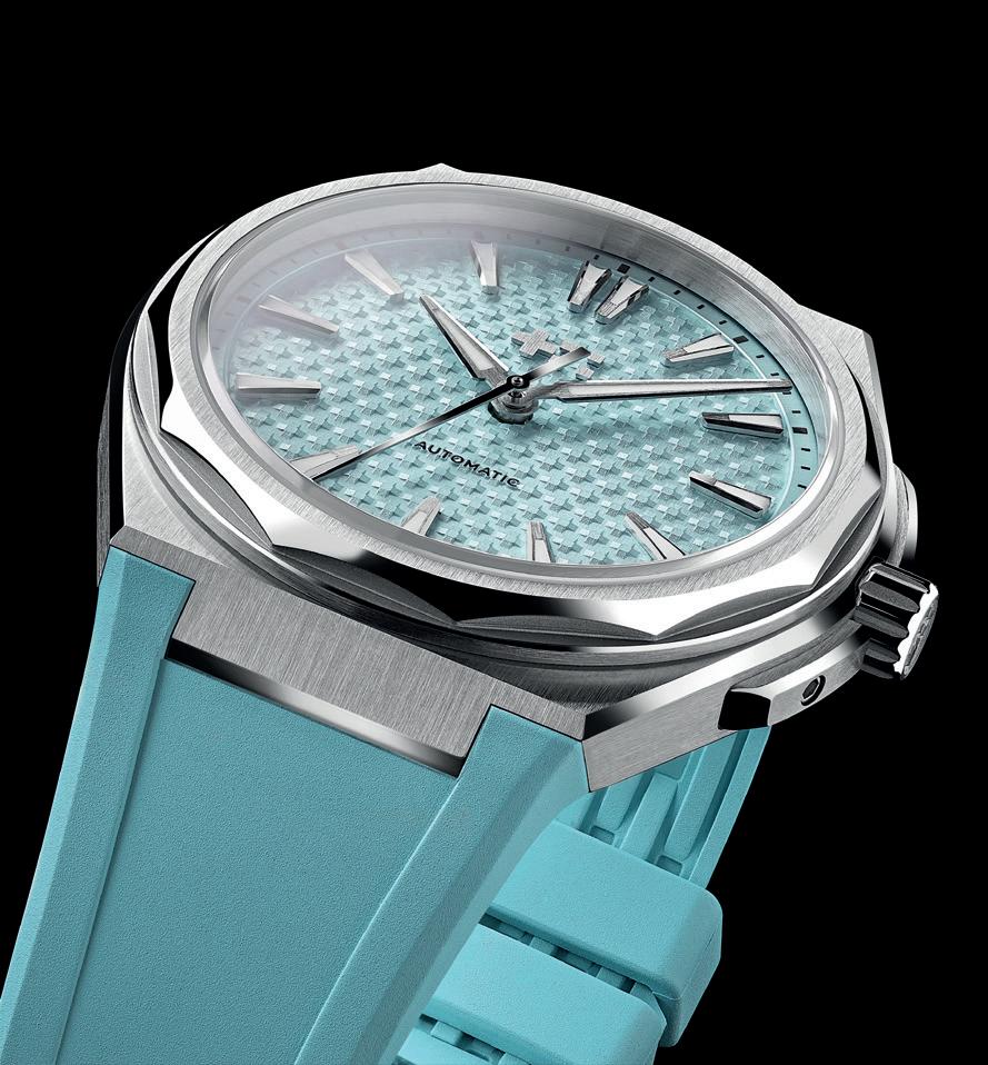 The Twelve (36) features a 36mm dodecagonal design and comes in four eye-catching colours: Nordic Blue, a lighter Glacier Blue (both familiar from the 40mm version), plus Alta White: a new twist on the bestselling Arctic White, which here becomes warmer, softer and dressier thanks to the use of gold hands and markers. Also exclusive to the Twelve (36) is a minty pale green called Frosted Lichen.