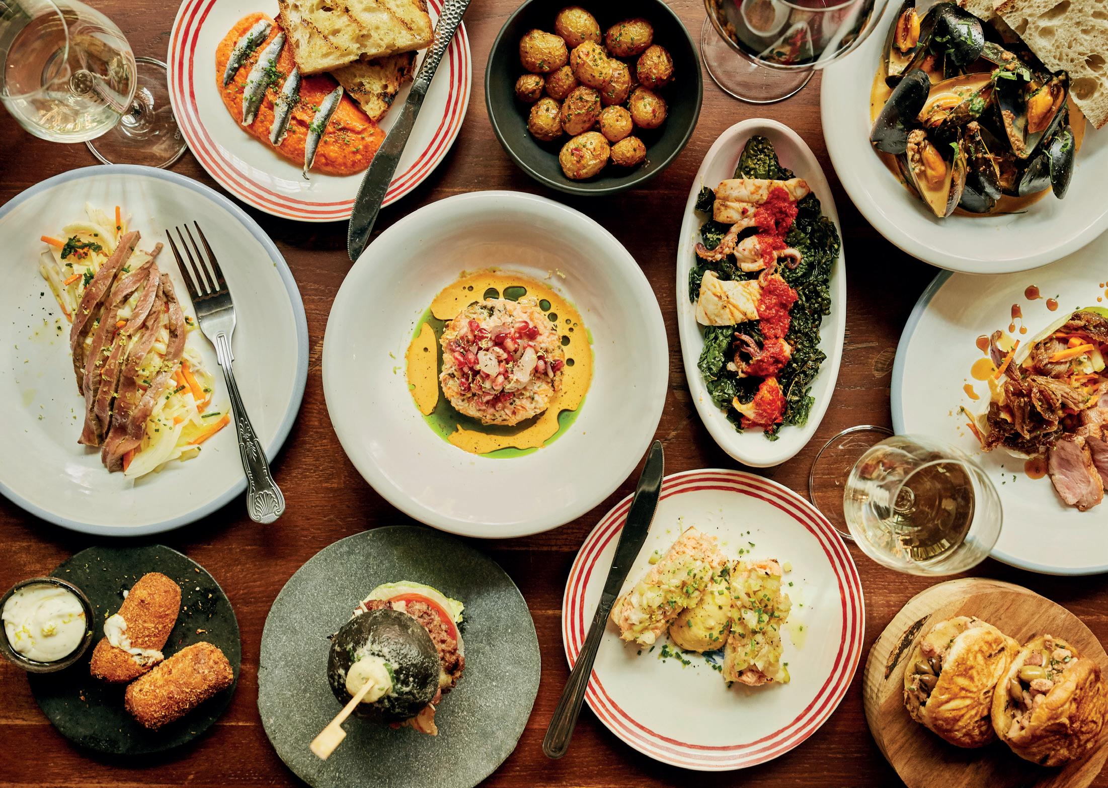 (accompany it with a truffle mac and cheese), menu options to start includes Pan Fried Scallops with pickled fennel, apple, crispy Parma ham and salsa Verde or Jones’ House Smoked Bacon Salad with stilton, baby spinach and mushrooms. A must try for mains is the Tamworth Pork Chop cooked on the Josper grill with paprika & honey glaze, green apple, radish & baby spinach salad or Whole Grilled Sea Bass with cherry tomatoes and rocket salad and yellow tomato chutney. To finish, top it off with a selection of English cheeses from the cheeseboard.