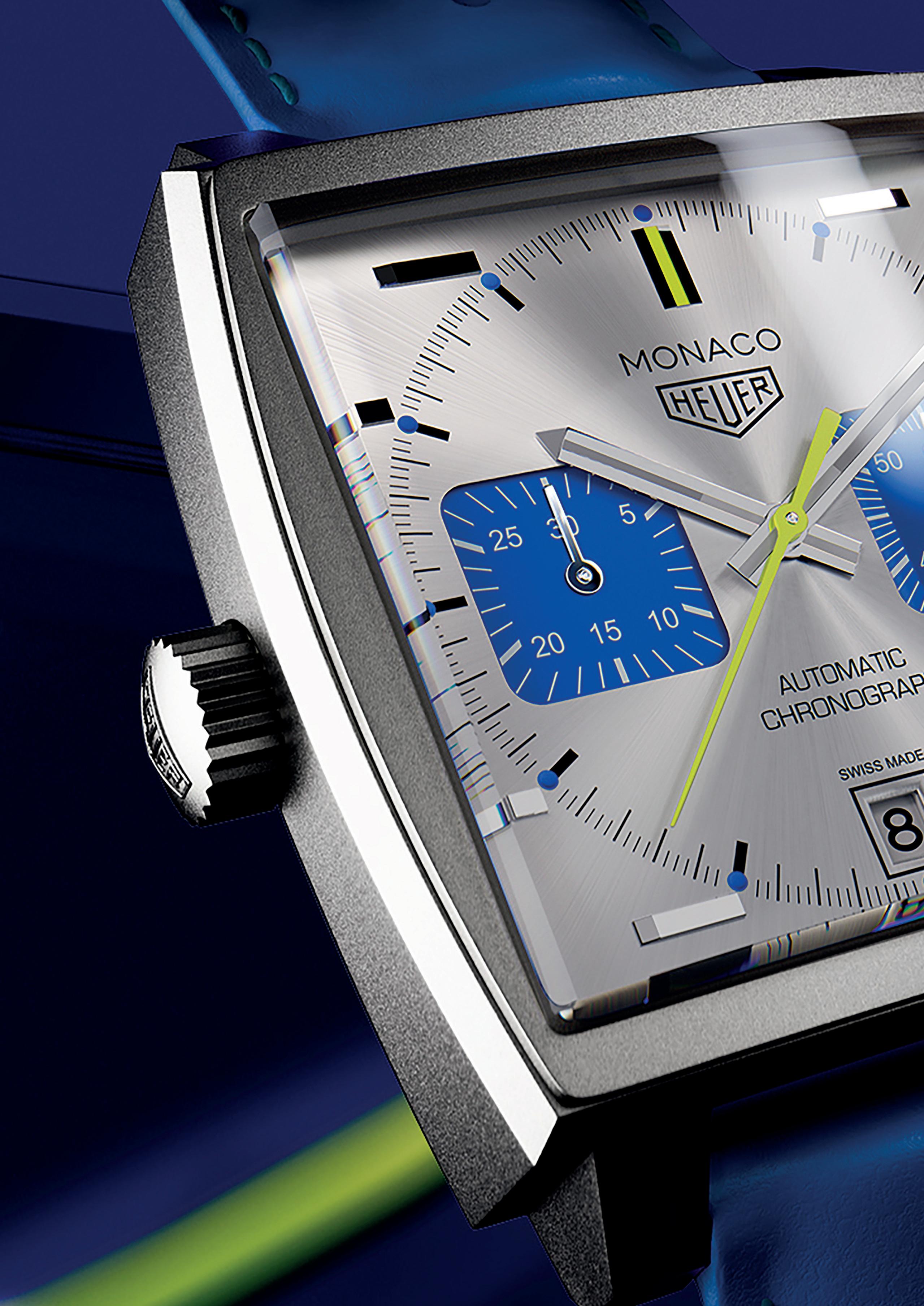 The hour and minute hands are enhanced with blue SuperLumiNova® for excellent visibility in all lighting conditions. Complementing this, the lacquered central hand in lime yellow, which adds a pop of colour. Collectively, these design elements harmonise the TAG Heuer Monaco Chronograph Racing Blue, creating a striking timepiece that captures the spirit of the automotive world.