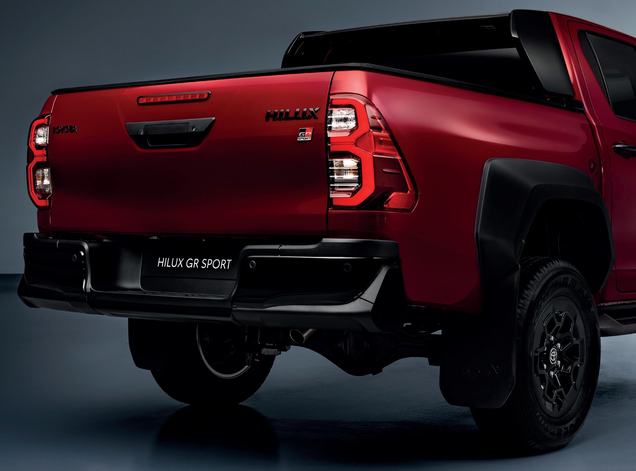 The Hilux GR Sport II exudes strength and sophistication. Its aggressive stance is highlighted by red coil springs and monotube shocks - black at the front and red at the rear - framed by bold black over-fenders. Distinctive 17-inch black alloy wheels with red