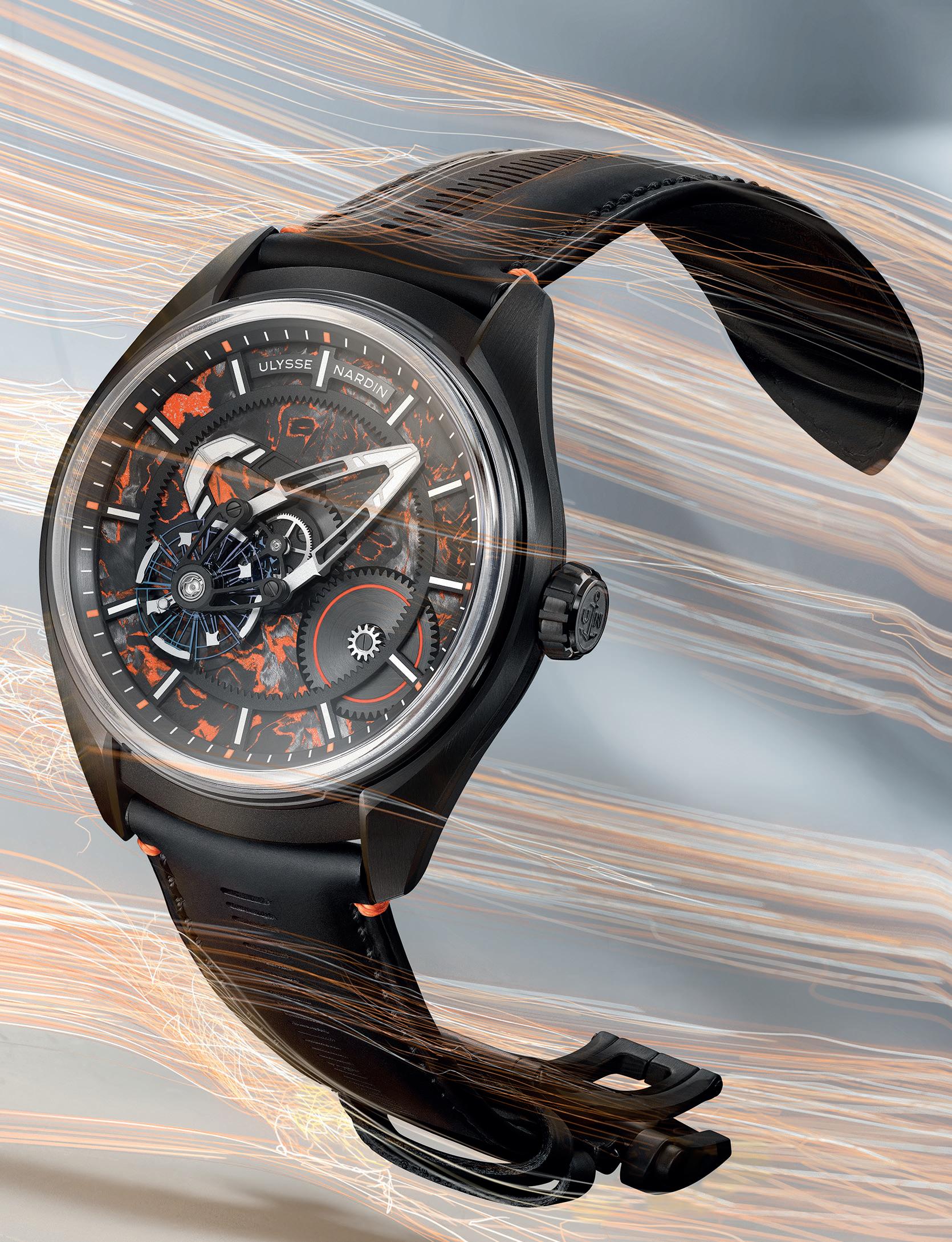 For the first time, the flying carousel is encircled by an orange Super-LumiNova® ring, enhancing both legibility and visual intensity. White Super-LumiNova® accents across the indexes and bridges sharpen contrast against the dark architecture. The black DLC-coated titanium case reinforces the watch’s lightweight resilience, while an open-worked black rubber strap with orange inserts and stitching completes the highperformance composition.