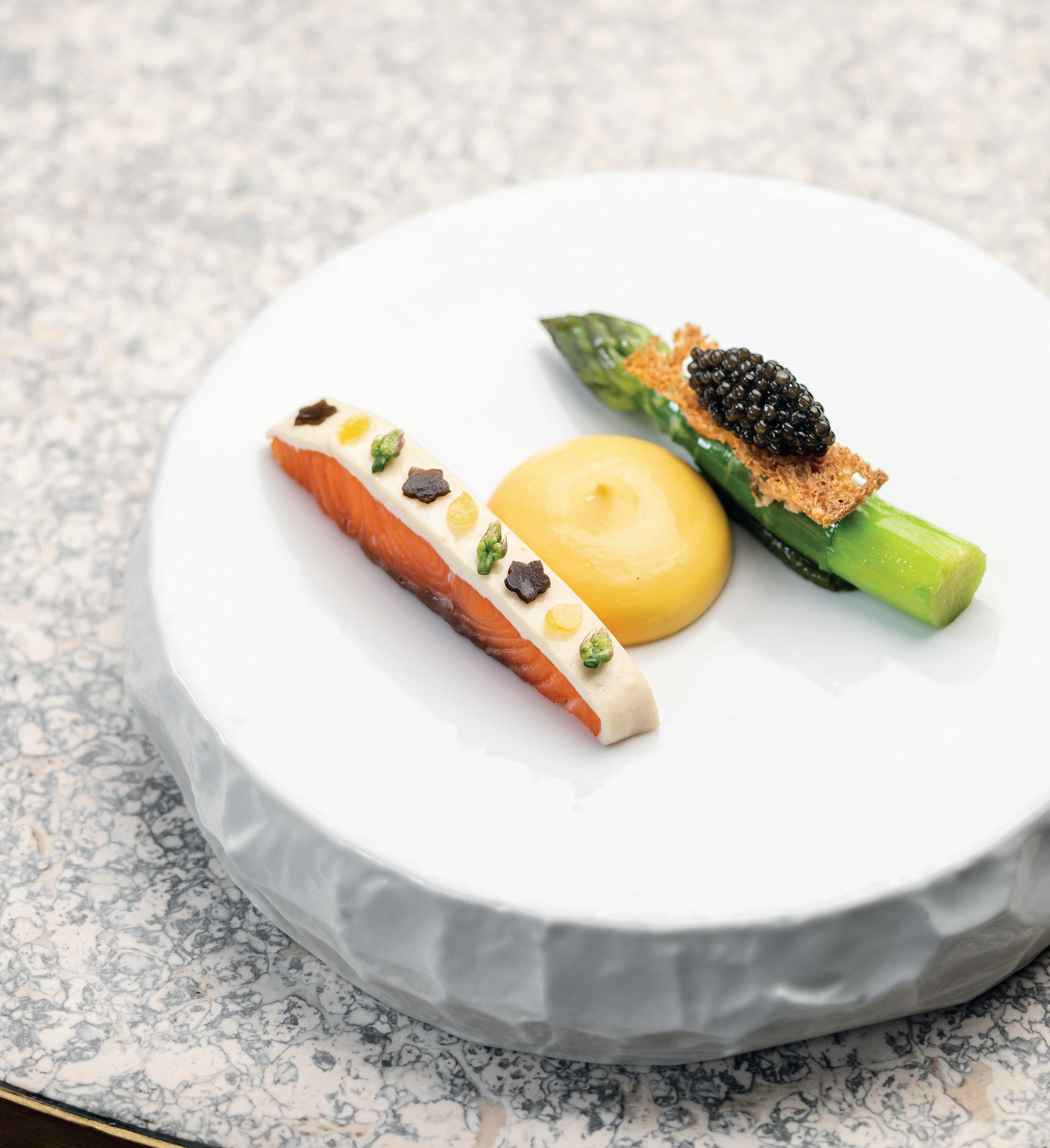 dipped in sugar, and Tom's favourite childhood fruit salad chew sweets. Prepared in the open kitchen, the intimate setting further enhances the personal experience, providing the ultimate lesson in quiet luxury, fine dining.
