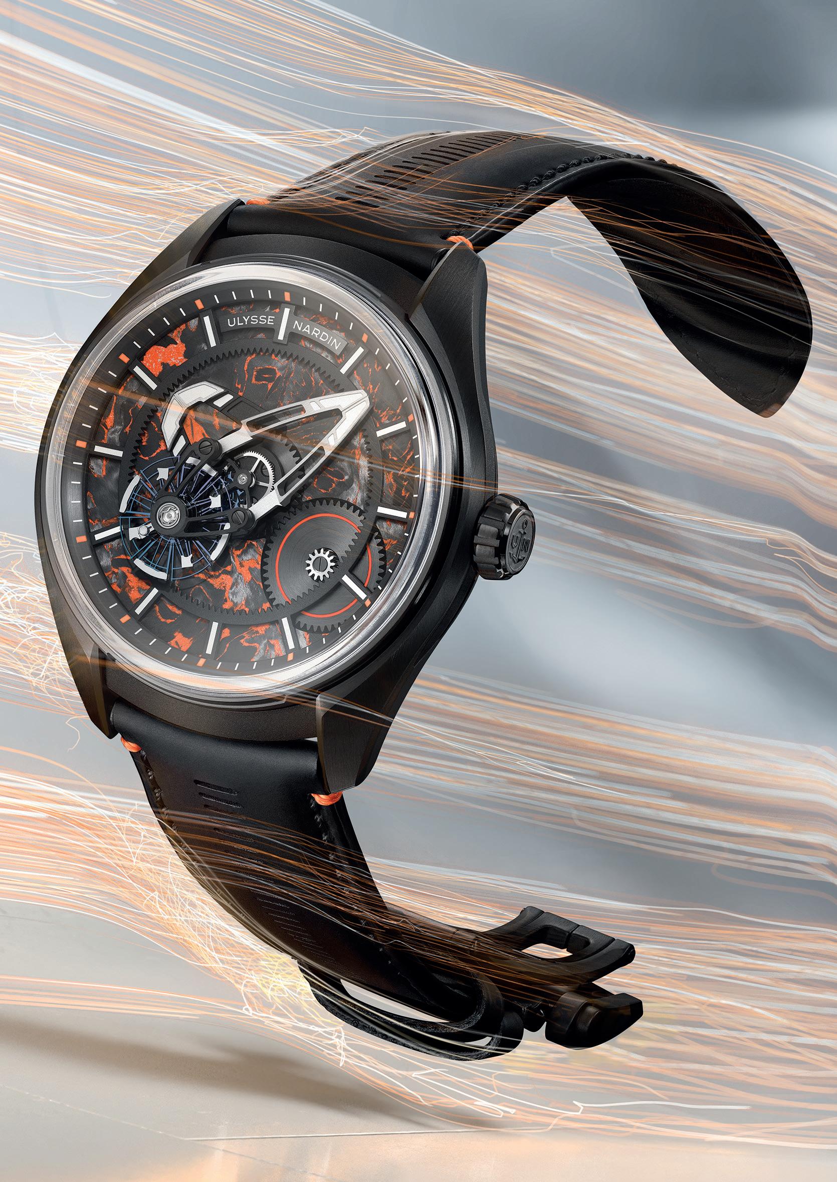 For the first time, the flying carousel is encircled by an orange Super-LumiNova® ring, enhancing both legibility and visual intensity. White Super-LumiNova® accents across the indexes and bridges sharpen contrast against the dark architecture. The black DLC-coated titanium case reinforces the watch’s lightweight resilience, while an open-worked black rubber strap with orange inserts and stitching completes the highperformance composition.